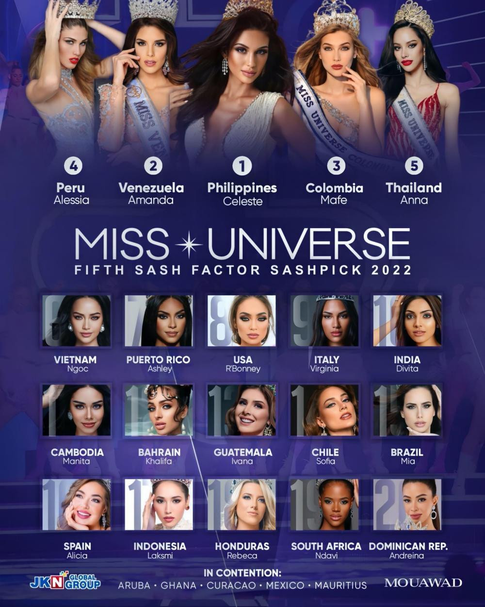 Ở BXH dự đoán lần thứ 5 của Sash Factor, thứ hạng của Hoa hậu Ngọc Châu và Hoa hậu Hoàn vũ Thái Lan cũng tăng đáng kể. Đại diện Thái Lan được dự đoán lọt Top 5, còn Hoa hậu Ngọc Châu vươn lên ở vị trí thứ 6 trong Top 10.