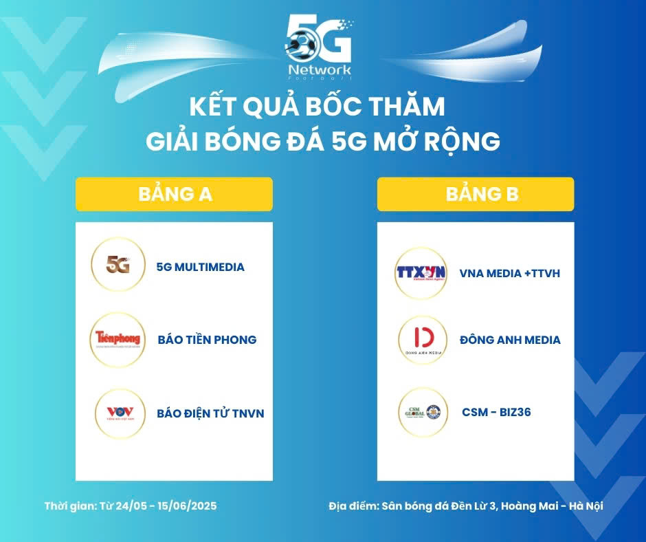 Giải bóng đá 5G mở rộng sẽ khai mạc vào lúc 8h sáng Chủ nhật ngày 25/5, các đội sẽ thi đấu vào buổi sáng các ngày cuối tuần tại sân bóng Đền Lừ 3, Phố Tân Mai, quận Hoàng Mai, Hà Nội.