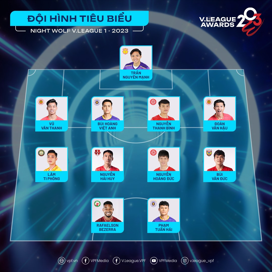 Cuối cùng, 2 vị trí tiền đạo thuộc về Phạm Tuấn Hải của Hà Nội FC và Rafaelson của Bình Định. Tuấn Hải ghi 6 bàn thắng và là mũi nhọn nguy hiểm của Hà Nội FC, trong khi Rafaelson là vua phá lưới V-League 2023 với 14 bàn thắng.
