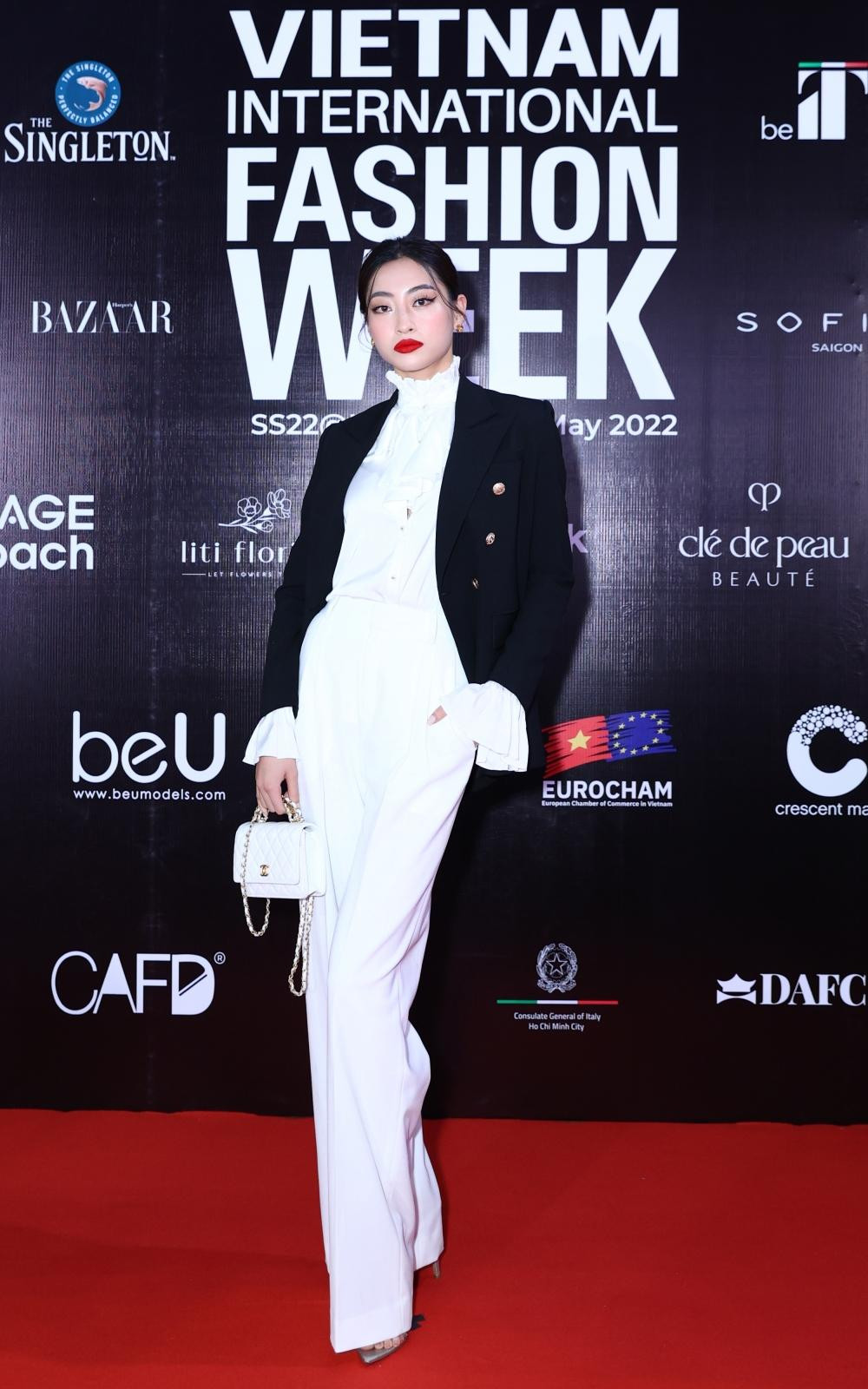 Hoa hậu Lương Thùy Linh đến từ rất sớm và chọn trang phục tone trắng - đen đơn giản nhưng sang trọng.