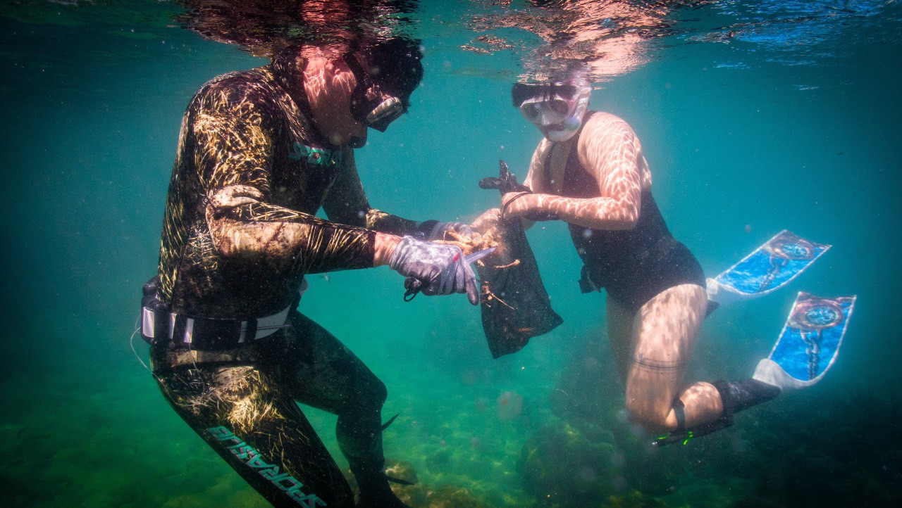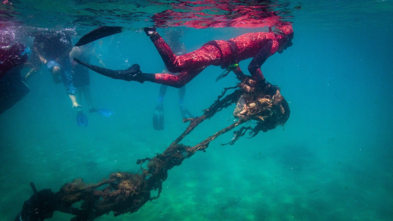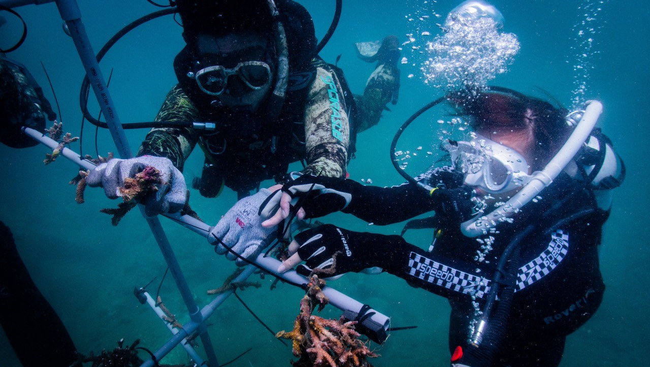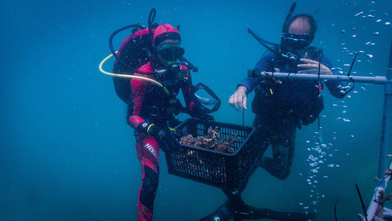| Các thành viên nhóm kiểm tra sự phát triển của san hô dưới đáy biển |