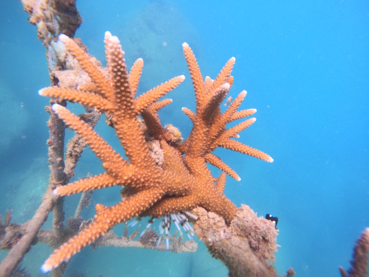 | Giá thể san hô phát triển tốt sau khi được nhóm nuôi cấy dưới đáy biển |