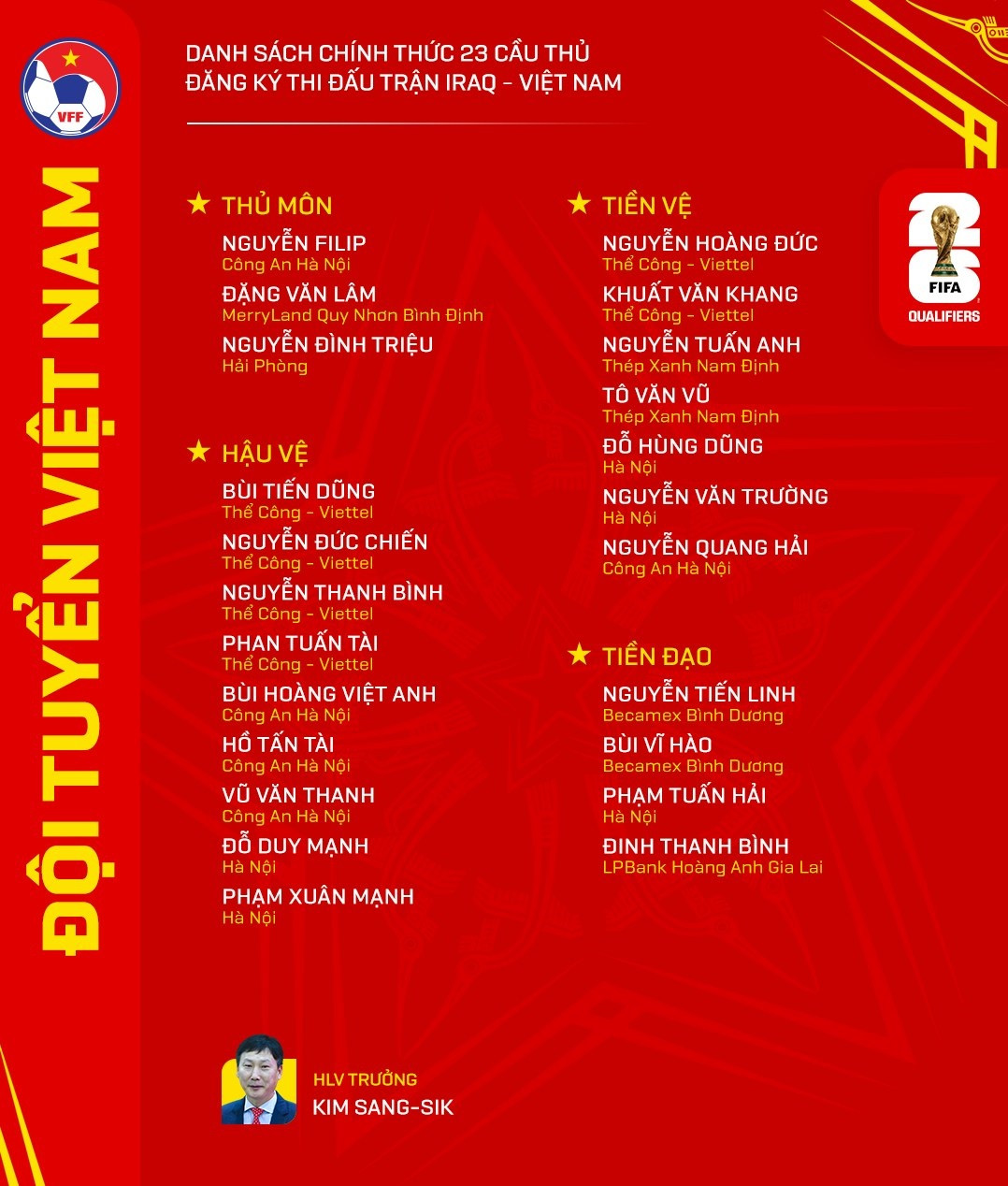 Danh sách tuyển Việt Nam đấu Iraq tại vòng loại World Cup 2026
