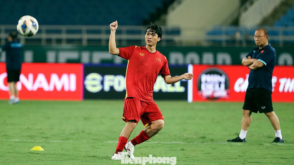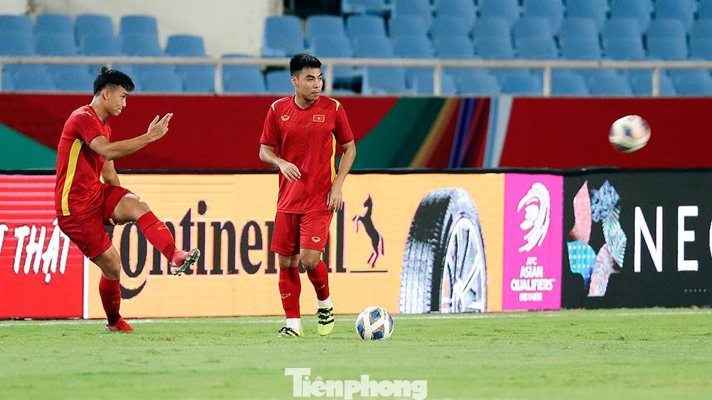 Tại buổi tập luyện tối 6/9 để làm quen và cảm nhận lại mặt sân, các cầu thủ đội tuyển Việt Nam đã khởi động, ban huấn luyện đưa ra bài tập phát bóng dài và đánh đầu.