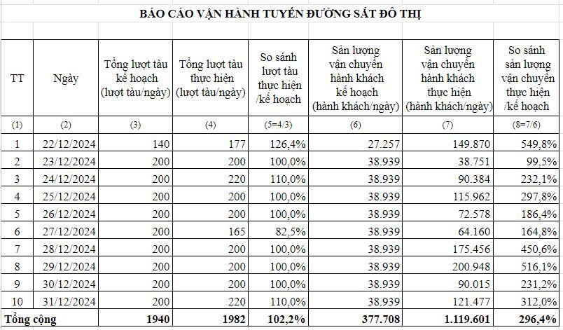 Trưa ngày 1/1, ông Lê Minh Triết - Giám đốc Công ty TNHH MTV Đường sắt đô thị số 1 TPHCM (HURC1, đơn vị vận hành tuyến) cho biết, để đáp ứng nhu cầu đi lại tăng cao của người dân trong dịp Tết Dương lịch năm 2025, được sự chấp thuận của Sở Giao thông vận tải về điều chỉnh kế hoạch hoạt động trong ngày 1/1/2025 từ 10h48 đến 22h, HURC sẽ điều chỉnh giảm thời gian giãn cách với tần suất: 8 phút/chuyến.