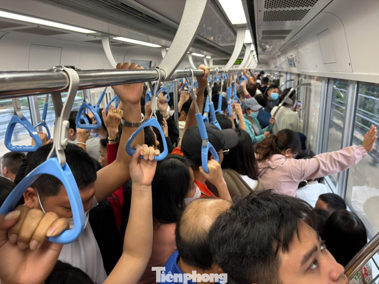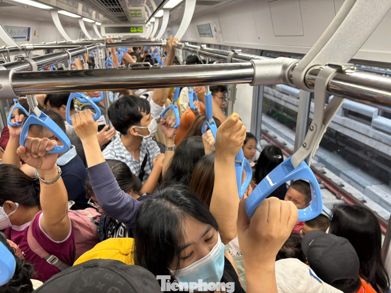 Đến 10h, tại ga Bến Thành đông nghịt người xếp hàng dài để chờ lên tàu. Theo các tình nguyện viên hỗ trợ, với lượng hành khách tăng đột biến thì người xếp hàng nhanh nhất cũng phải hơn 30 phút mới có thể lên được tàu Metro.