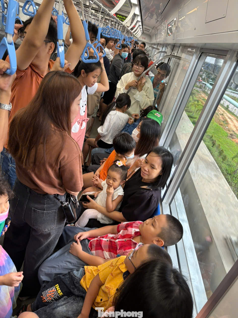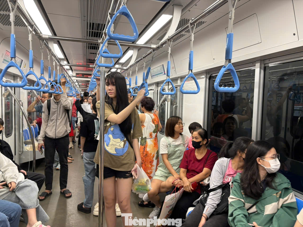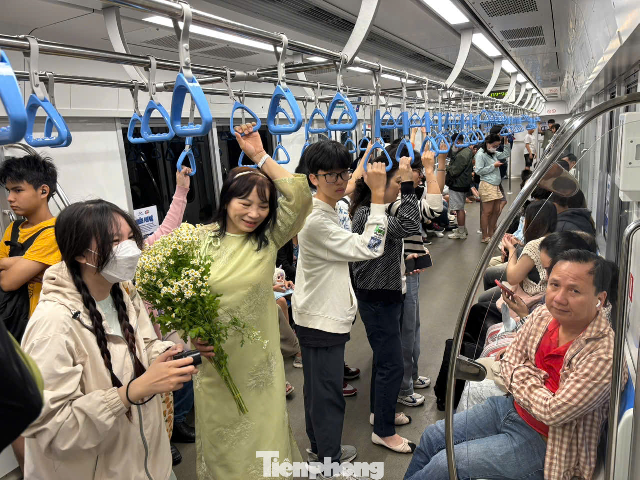 Đôi bạn Bảo Uyên (trái) và Phương Hà, học sinh lớp 9 Trường THCS Hoa Lư (TP.Thủ Đức), vào Trung tâm thành phố chơi bằng tàu Metro. Đây là lần đầu tiên cả hai được trải nghiệm Metro nên dù phải xếp hàng khá lâu nhưng họ vẫn rất vui vẻ.
