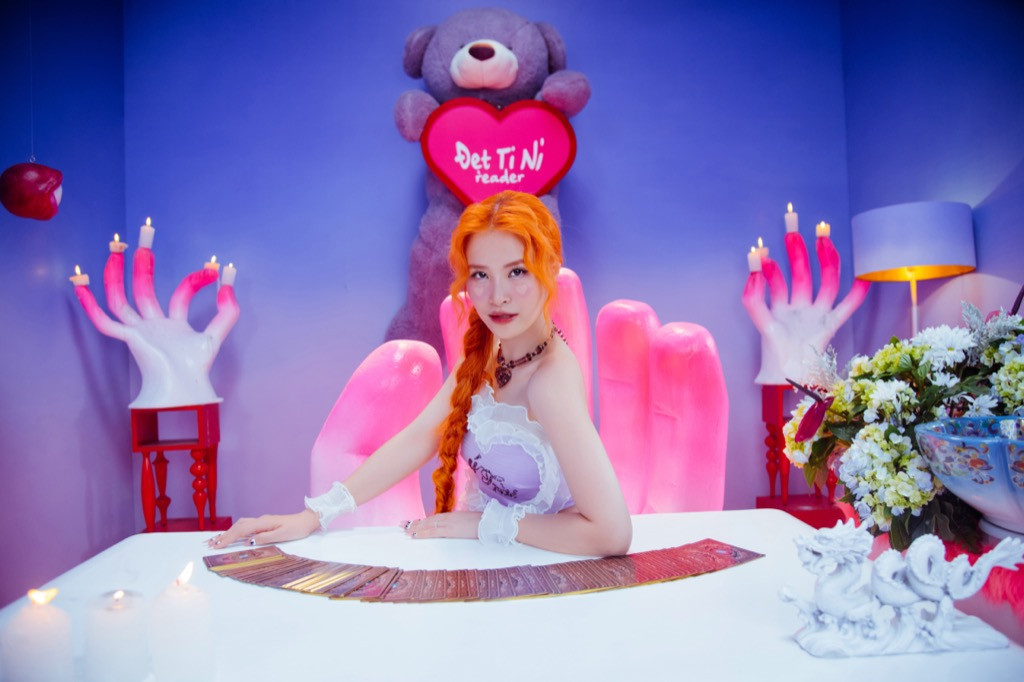 Đông Nhi xuất hiện với hình tượng là một Tarot reader nhưng được biến hóa thành “Đẹt-Ti-Ni Reader” - người xem định mệnh. Và khách hàng xem đường tình duyên bằng hình thức online của “thầy bói” Đông Nhi chính là… tlinh.