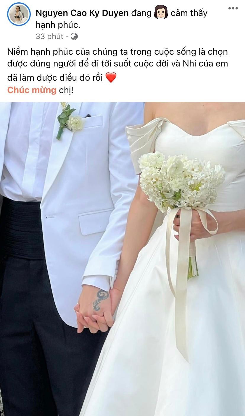 Các sao Việt khác rất tích cực đăng bài chúc mừng lên mạng xã hội. Hoa hậu Kỳ Duyên chia sẻ: "Niềm hạnh phúc của chúng ta trong cuộc sống là chọn được đúng người để đi tới suốt cuộc đời và Nhi của em đã làm được điều đó rồi. Chúc mừng chị".