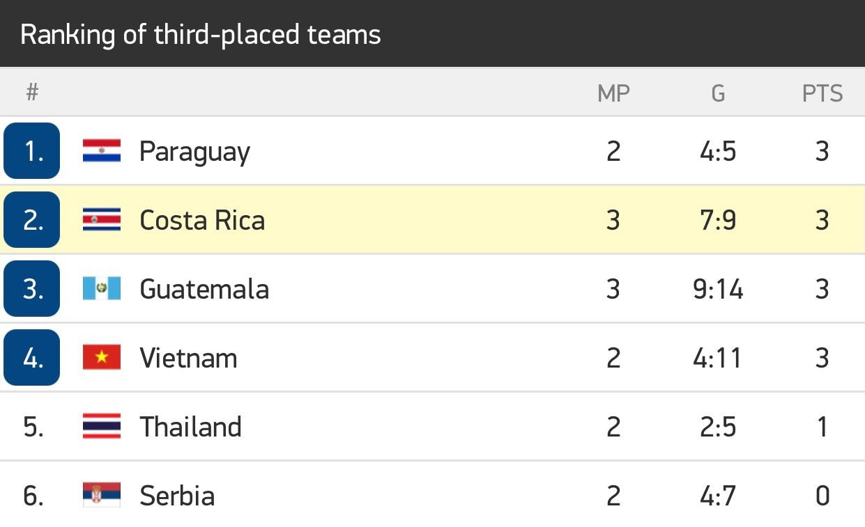 Trong khi đó với 3 điểm và hiệu số -1, Paraguay, đội từng thắng Việt Nam 7-1 ở World Cup 2016, cũng khó bị loại. Bởi trận cuối, họ và Nhật Bản có tương quan không chênh lệch là bao nên khó có việc Nhật Bản thắng đại diện Nam Mỹ với cách biệt từ 7 bàn trở lên để khiến Paraguay có hiệu số bàn thắng bại kém hơn Việt Nam.