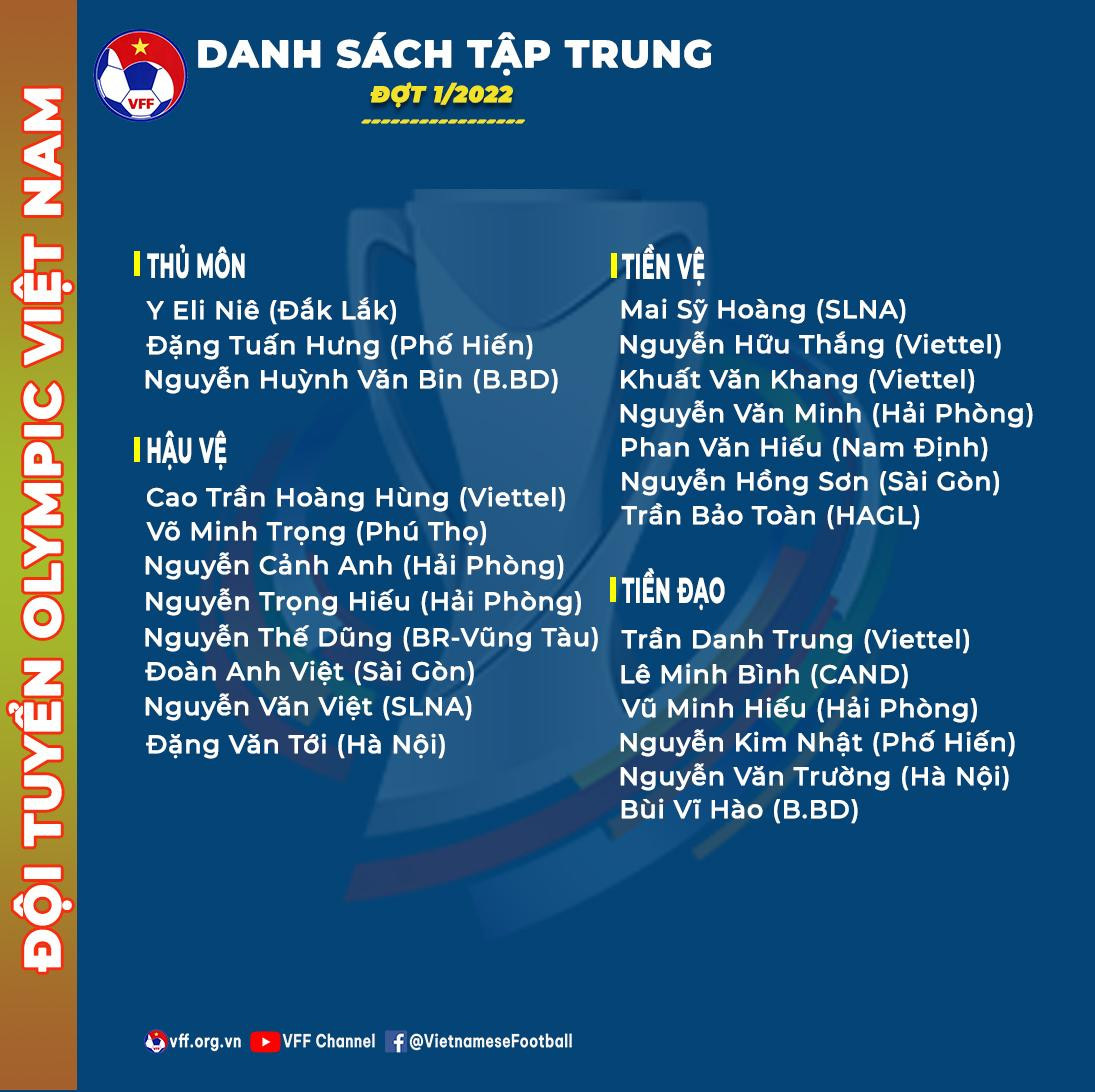 Để chuẩn bị cho VCK U23 châu Á 2022 và Asiad 19, ĐT Olympic Việt Nam sẽ bắt đầu tập trung đợt 1/2022, từ ngày 30/4 đến ngày 23/5/2022 tại Trung tâm đào tạo bóng đá trẻ Việt Nam.