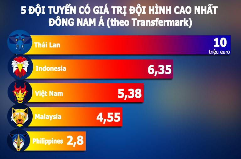 Thực ra trước giải, đội bóng của HLV Park Hang Seo vẫn đứng thứ 3, kém Malaysia và Thái Lan. Nhưng do Malaysia thi đấu tệ nên hầu hết các cầu thủ của họ rớt giá mạnh. Lúc này, họ chỉ còn có giá 4,55 triệu euro, bị Việt Nam và đặc biệt là Indonesia vượt mặt.