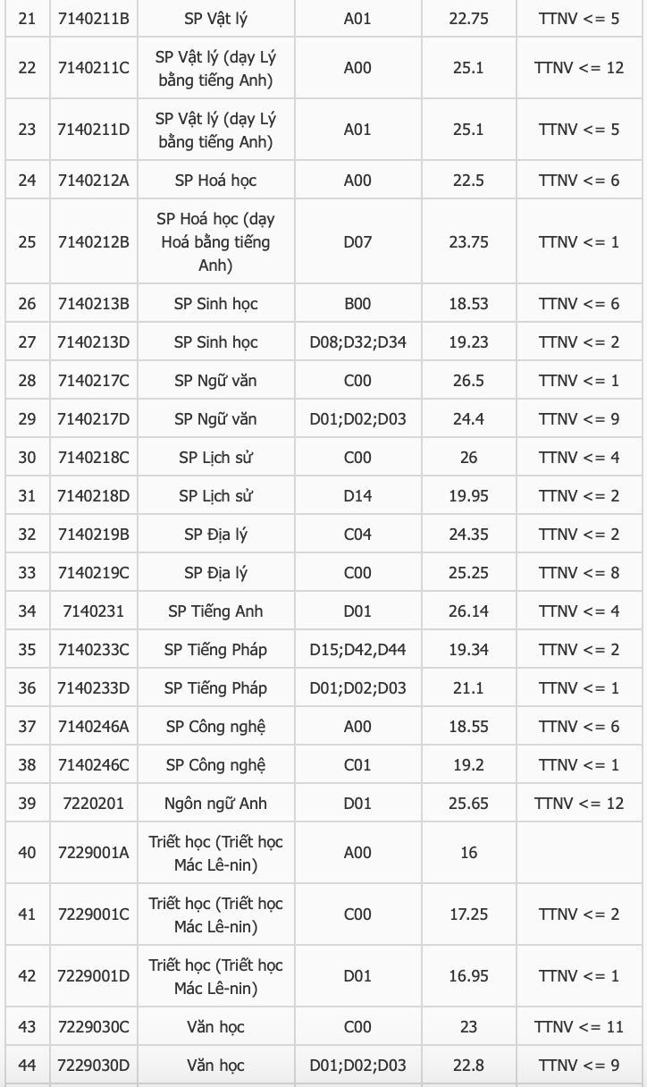 - Các ngành Sư phạm Vật lý, Sư phạm Hóa, Sư phạm Lý bằng tiếng Anh, Sư phạm Hóa bằng tiếng Anh dự kiến điểm chuẩn trên dưới 23 điểm.