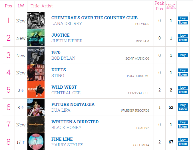 Trong quá khứ, Lana Del Rey từng có 4 lần đạt vị trí số 1 BXH Album chính thức của Vương quốc Anh (UK Official Albums Chart) với Born to die vào năm 2012, Ultraviolence và Lust for life đều vào năm 2017. Lần còn lại là cách đây 2 năm, với album mang tên Norman F**king Rockwell. Vào ngày 14/6 tới, “nàng thơ” của dòng nhạc đương đại dự kiến sẽ ra mắt album tiếp theo mang tên Rock Candy Sweet.