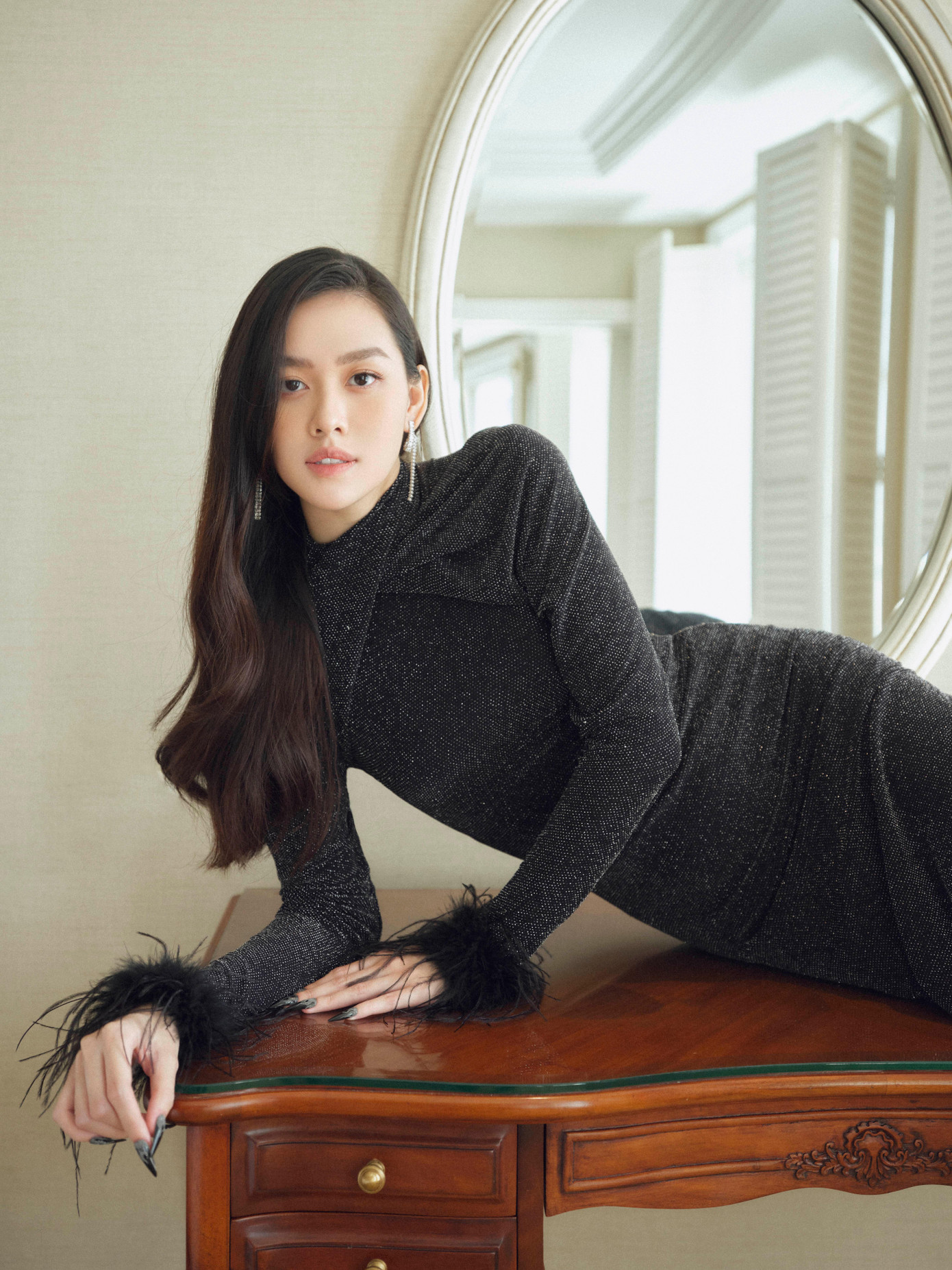 Lần này, Tường San khoe khéo được sắc vóc chuẩn chỉnh dù đã làm mẹ. Top 8 Hoa hậu Quốc tế biến hóa đa dạng phong cách, từ ngọt ngào đến quyến rũ đầy rực rỡ. Vẫn sử dụng các chất liệu cao cấp: organza, chiffon hay voan tơ sống xuyên thấu như mọi lần, Lê Thanh Hòa mang đến sự khác biệt trong kỹ thuật drapping, cắt may phức tạp. Các chi tiết đính kết, thêu thủ công cũng được được đánh giá cao bởi độ tỉ mỉ, công phu. Nhờ đó, tôn được sắc vóc đáng ngưỡng mộ của Tường San.