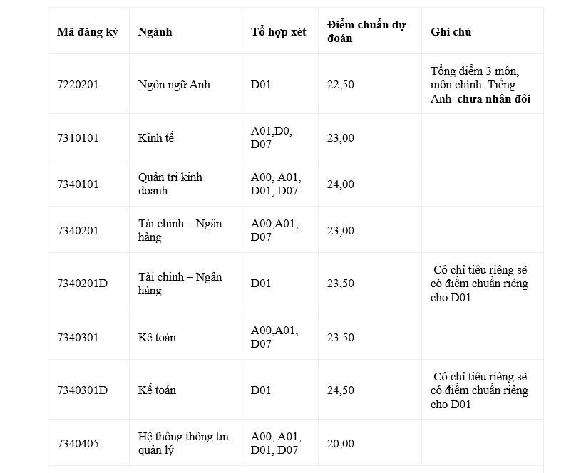 Dự đoán điểm điểm chuẩn các chương trình đào tạo chất lượng cao (tổng điểm 3 môn, môn chính Tiếng Anh chưa nhân đôi); mức học phí 4,5 triệu/1 tháng: