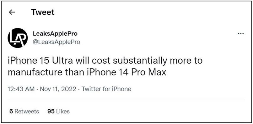 Leaker nổi tiếng LeaksApplePro đã chia sẻ trên tweet rằng iPhone 15 Ultra sẽ có chi phí sản xuất cao hơn đáng kể so với iPhone 14 Pro Max. Tuy nhiên, người này lại không tiết lộ giá bán cụ thể của sản phẩm là bao nhiêu.