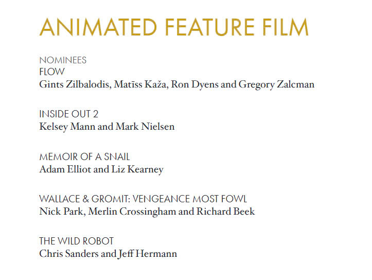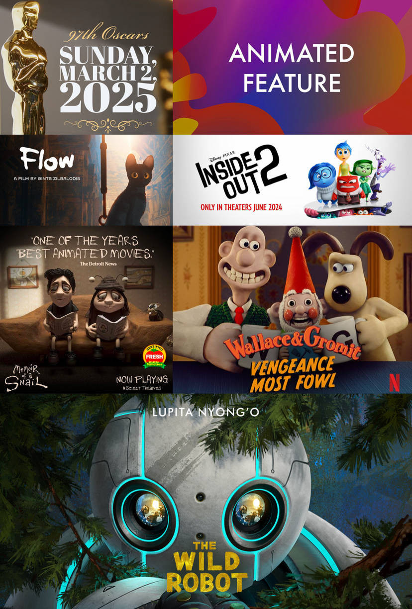 5 ứng viên đa dạng về phong cách và nội dung gồm Flow, Inside Out 2, The Wild Robot, Memoir of a Snail, Wallace & Gromit và Vengeance Most Fowl sẽ đua nhau giành tượng vàng năm nay.