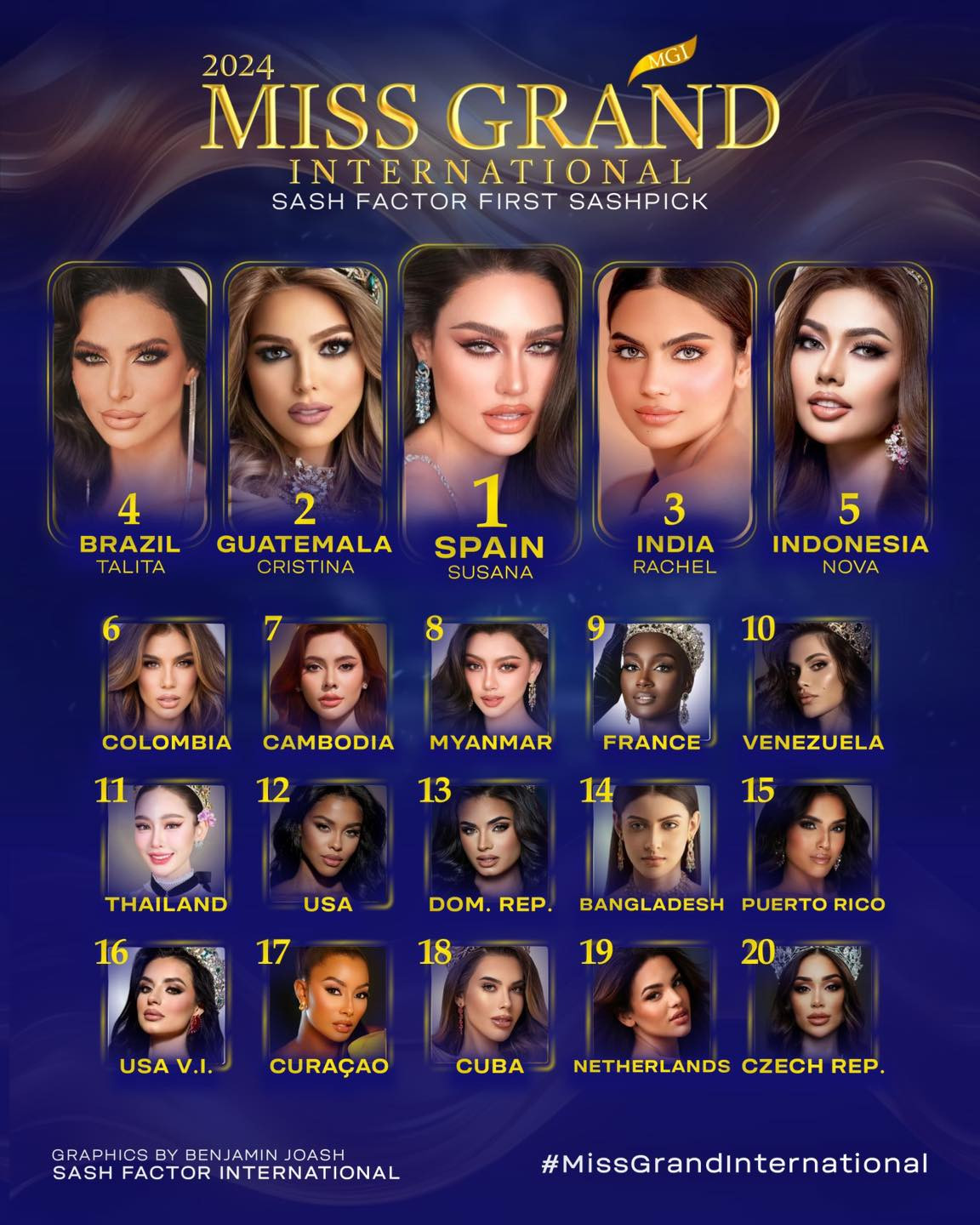 Cuối năm là thời điểm các cuộc thi nhan sắc quốc tế liên tục diễn ra. Các chuyên trang nhan sắc quốc tế do vậy cũng liên tục tung BXH dự đoán. Một trong những chuyên trang quen thuộc nhất với fan sắc đẹp Việt là Sash Factor đã đưa ra BXH dự đoán đầu tiên cho cuộc thi Miss Grand International 2024.