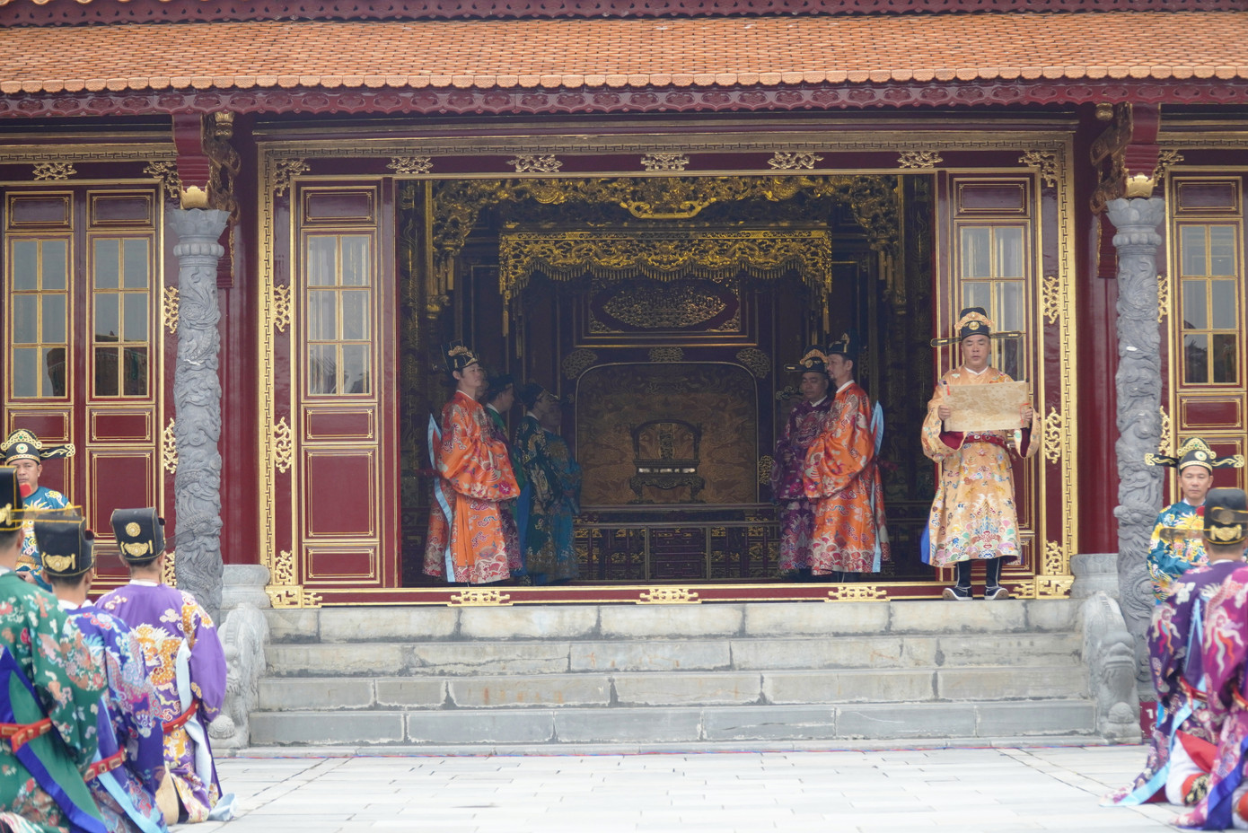 | Đầu tiên là những nghi thức đại triều ở sân và bên trong điện Thái Hòa. |
