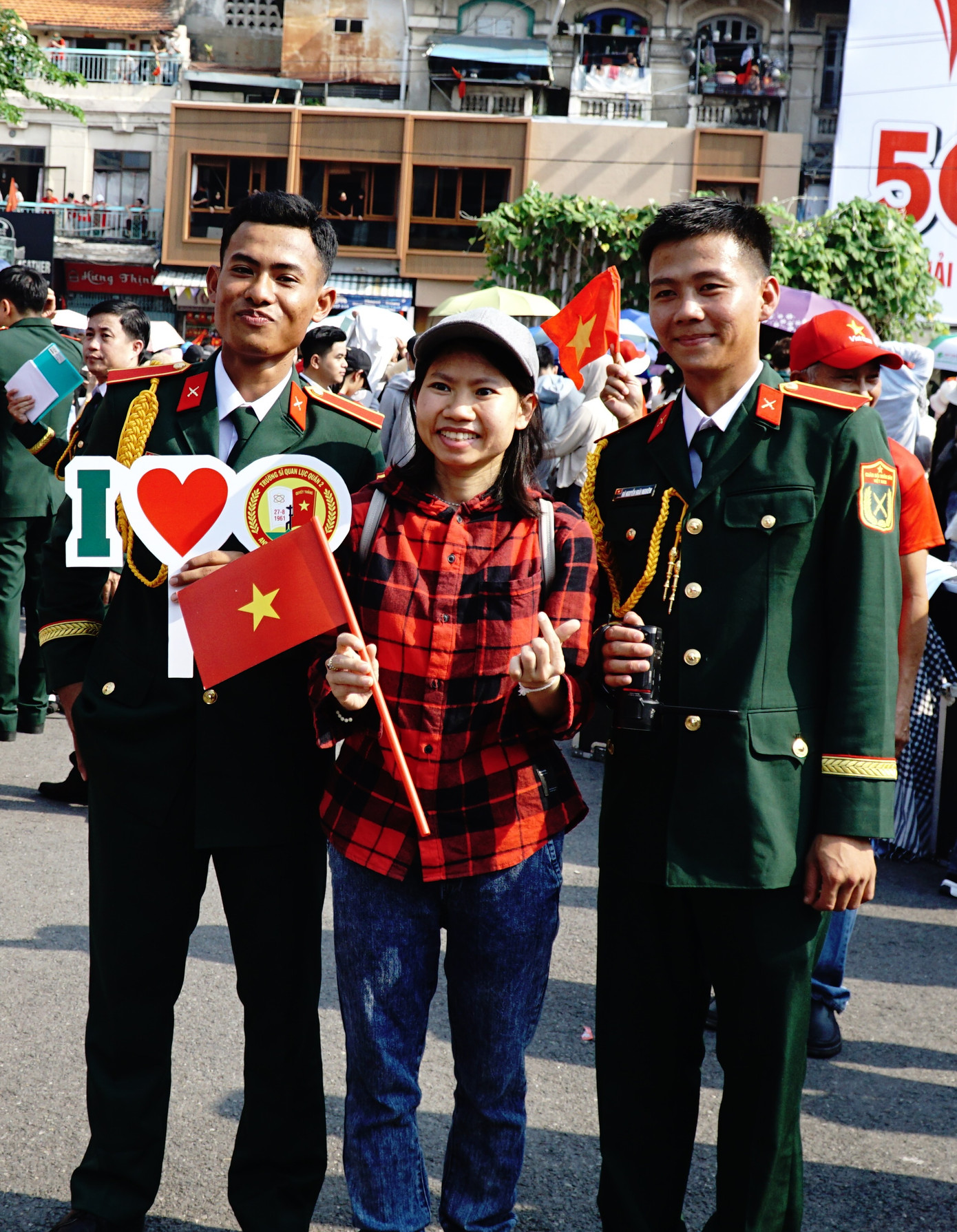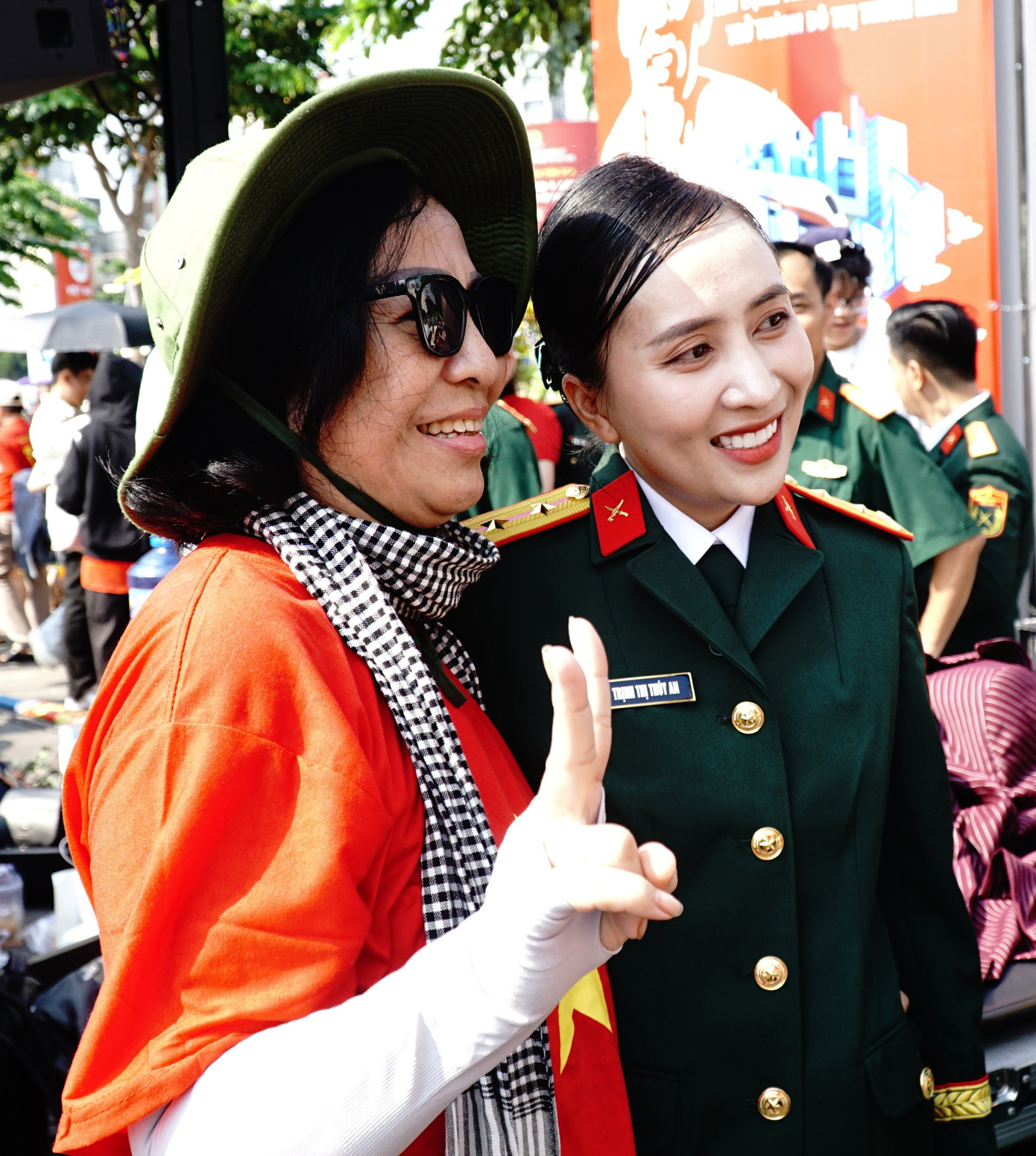 Trước yêu cầu của người dân, các chiến sĩ 'lính mẫu" Trường Sĩ quan Lục quân 2 luôn tươi cười để giúp mọi người có được những tấm hình đẹp, mặc dù thời tiết nắng nóng.