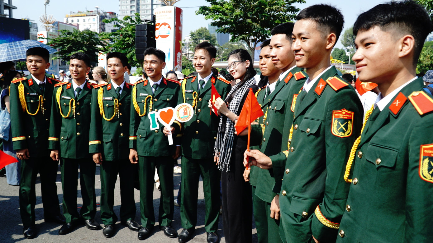 TPO - Trong cuộc giao lưu văn nghệ giữa Trường Sĩ quan Lục quân 2, đội Văn công Quân khu 7 với những người dân đi xem lễ diễu binh, diễu hành kỷ niệm 50 năm ngày thống nhất đất nước tại Công viên 23/9, các sĩ quan trẻ của Trường Sĩ quan Lục quân 2 đã trở thành đội "lính mẫu” hút khách khi rất nhiều người dân xin được chụp hình chung.