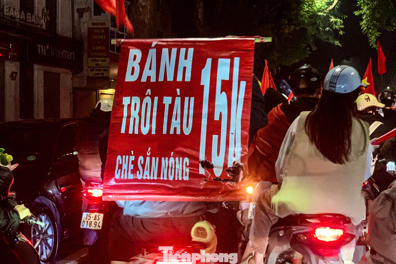 | Tranh thủ bán bánh mỳ khi ra đường ăn mừng. |