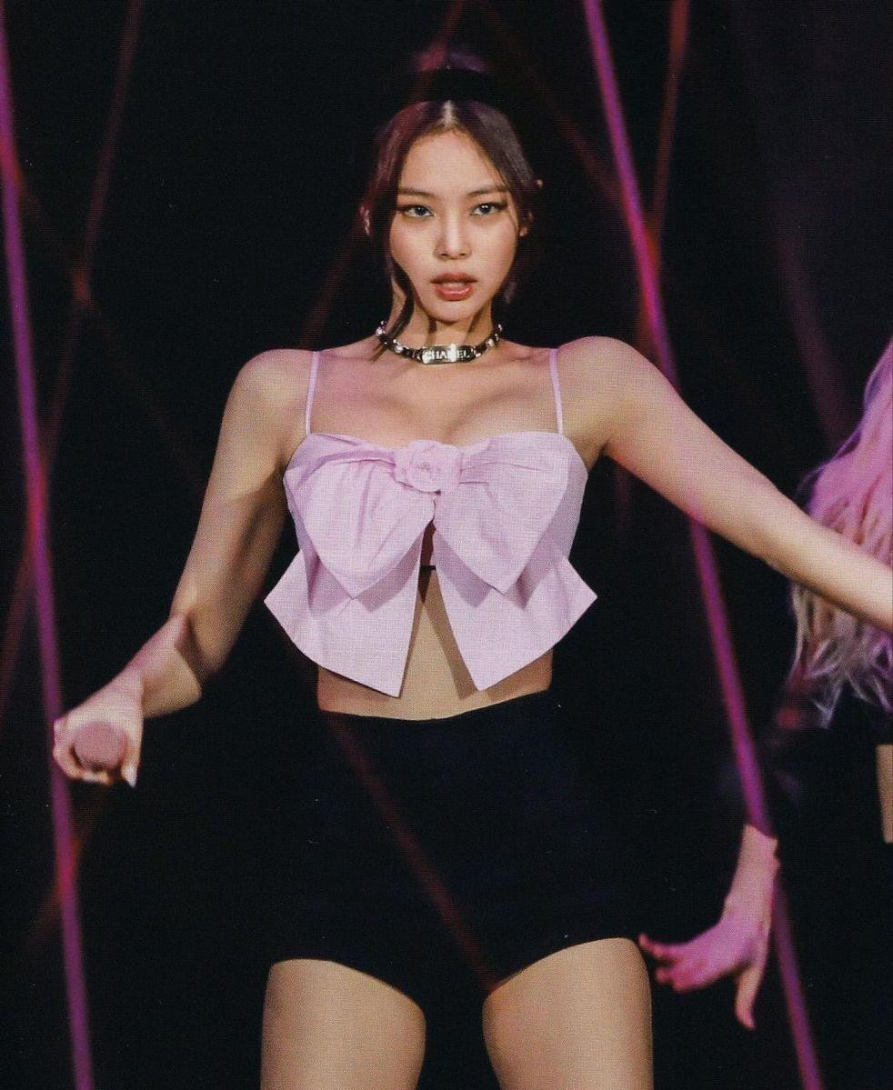 Chẳng cần phụ kiện cầu kỳ hay trang phục rườm rà, áo hai dây lửng và quần soóc siêu ngắn vẫn giúp Jennie sáng bừng trên sân khấu. Thân hình đồng hồ cát của Jennie rất hợp với những trang phục ôm sát như thế này.