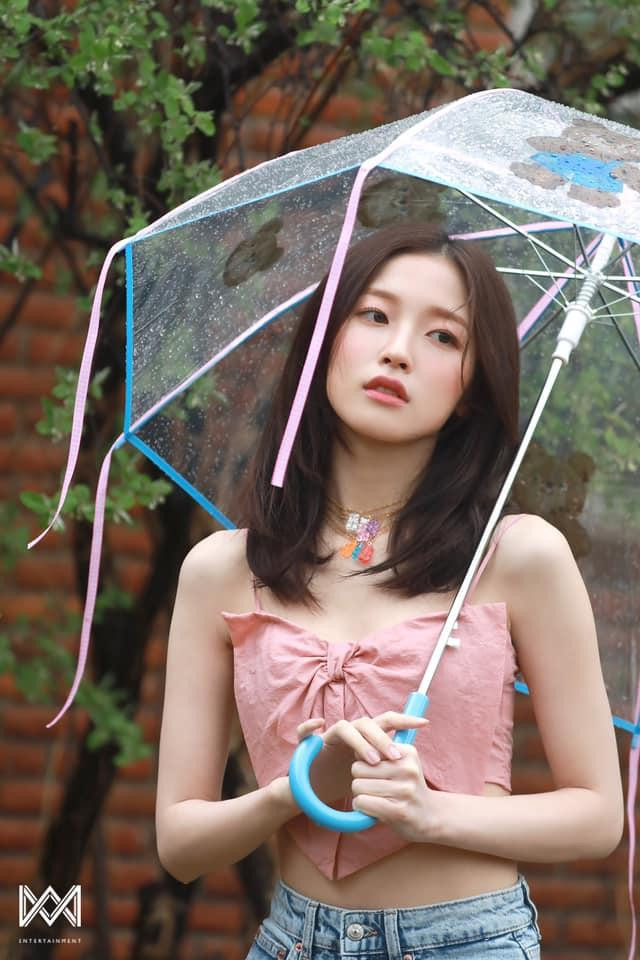 Arin có dáng người mảnh mai nhỏ nhắn, thần thái ngây thơ đáng yêu nên dù có mặc một chiếc áo hai dây dáng lửng thì nhìn thành viên nhóm Oh My Girl vẫn rất kín đáo, ngọt ngào.