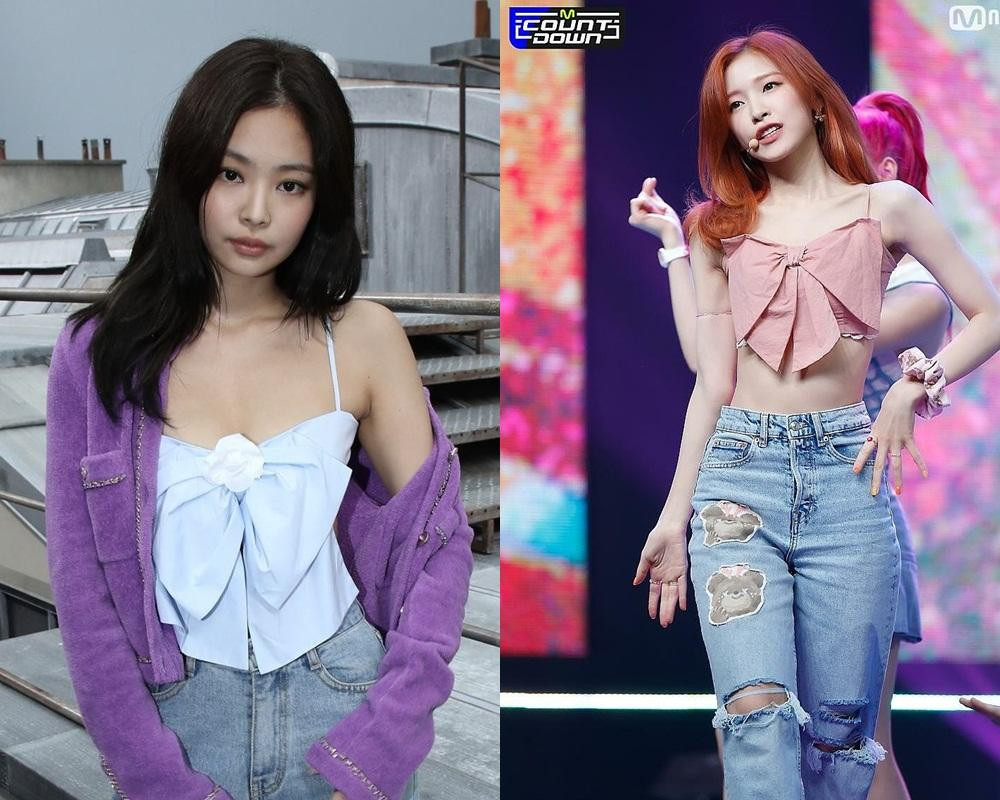 Mới đây, Arin (Oh My Girl) cũng có màn đụng hàng thú vị với Jennie. Vì khí chất và vóc dáng của Arin đối lập với Jennie nên tuy mặc cùng một kiểu áo, hai nữ idol nhìn hoàn toàn khác biệt.