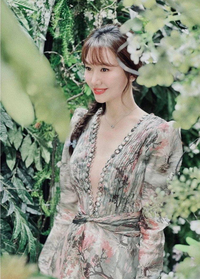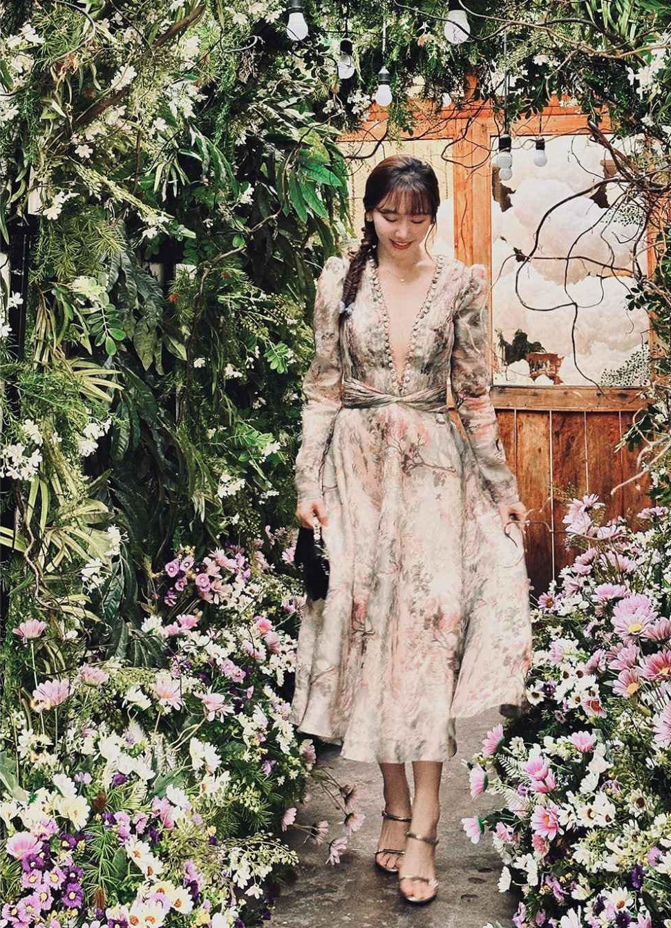 Hari Won chọn tóc tết lệch một bên để càng thêm dịu dàng, nhẹ nhàng trong bộ váy voan in hoa. Có thể thấy các người đẹp đều tiết chế phụ kiện bởi bản thân trang phục đã đủ nhiều chi tiết.