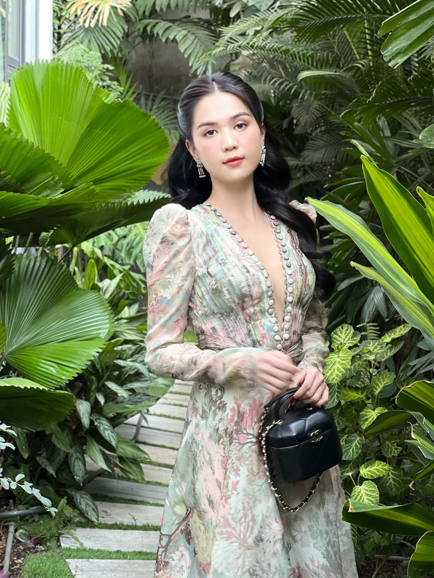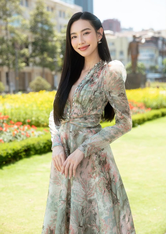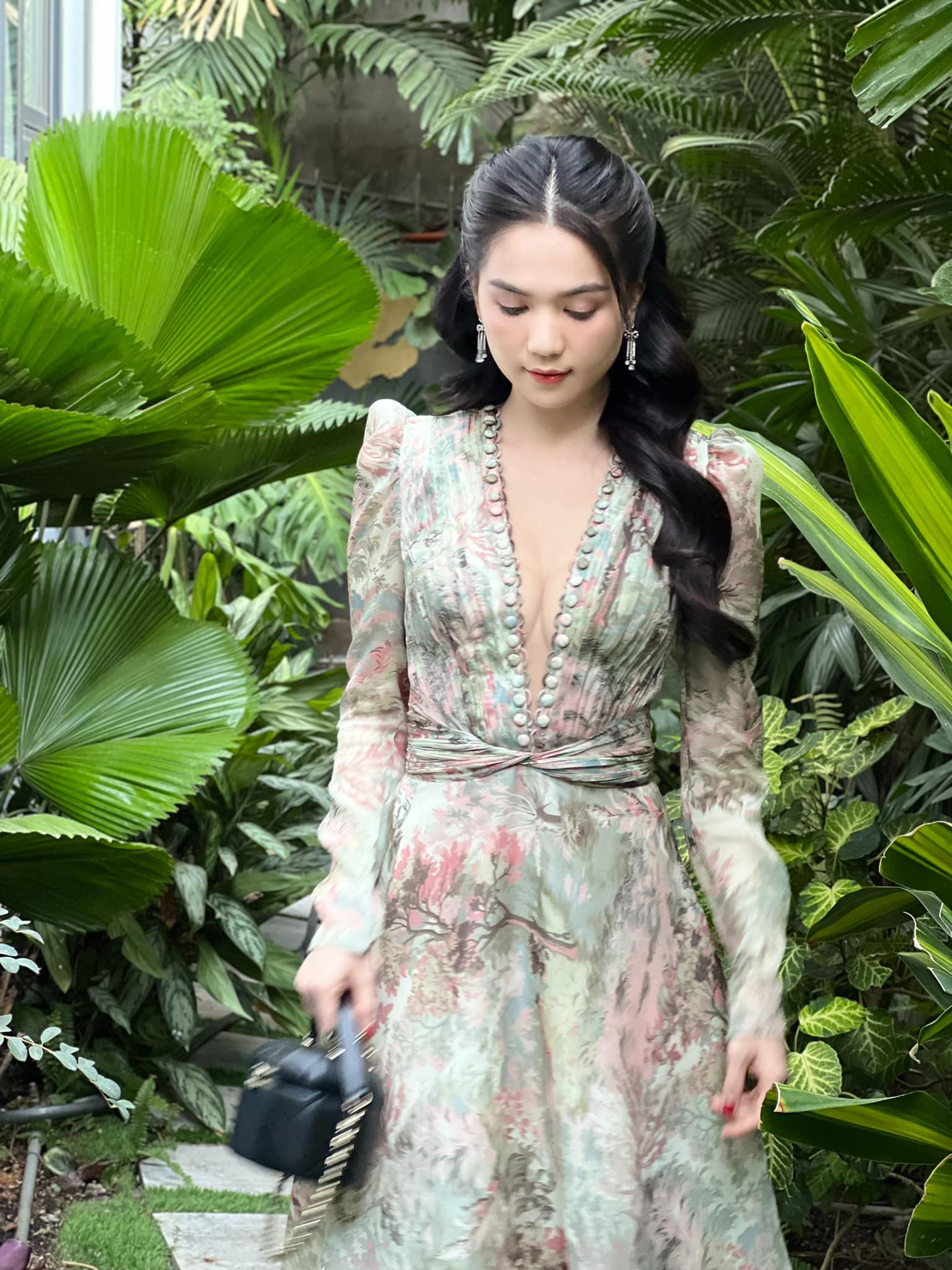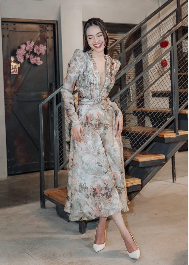 Hoa hậu Thùy Tiên cũng không đứng ngoài cơn sốt váy hoa này. Trong thiết kế gốc, bộ váy đã có thêm lớp voan màu da che bớt phần cổ chữ V để người mặc không gặp phải sự cố trang phục. Nhưng Thùy Tiên còn cẩn thận hơn nữa khi chỉnh sửa để lớp voan này dày hơn.