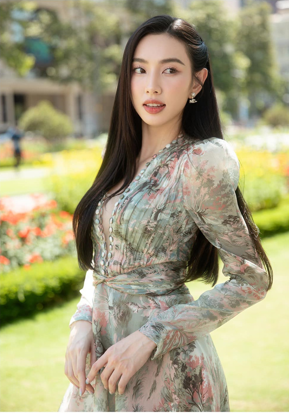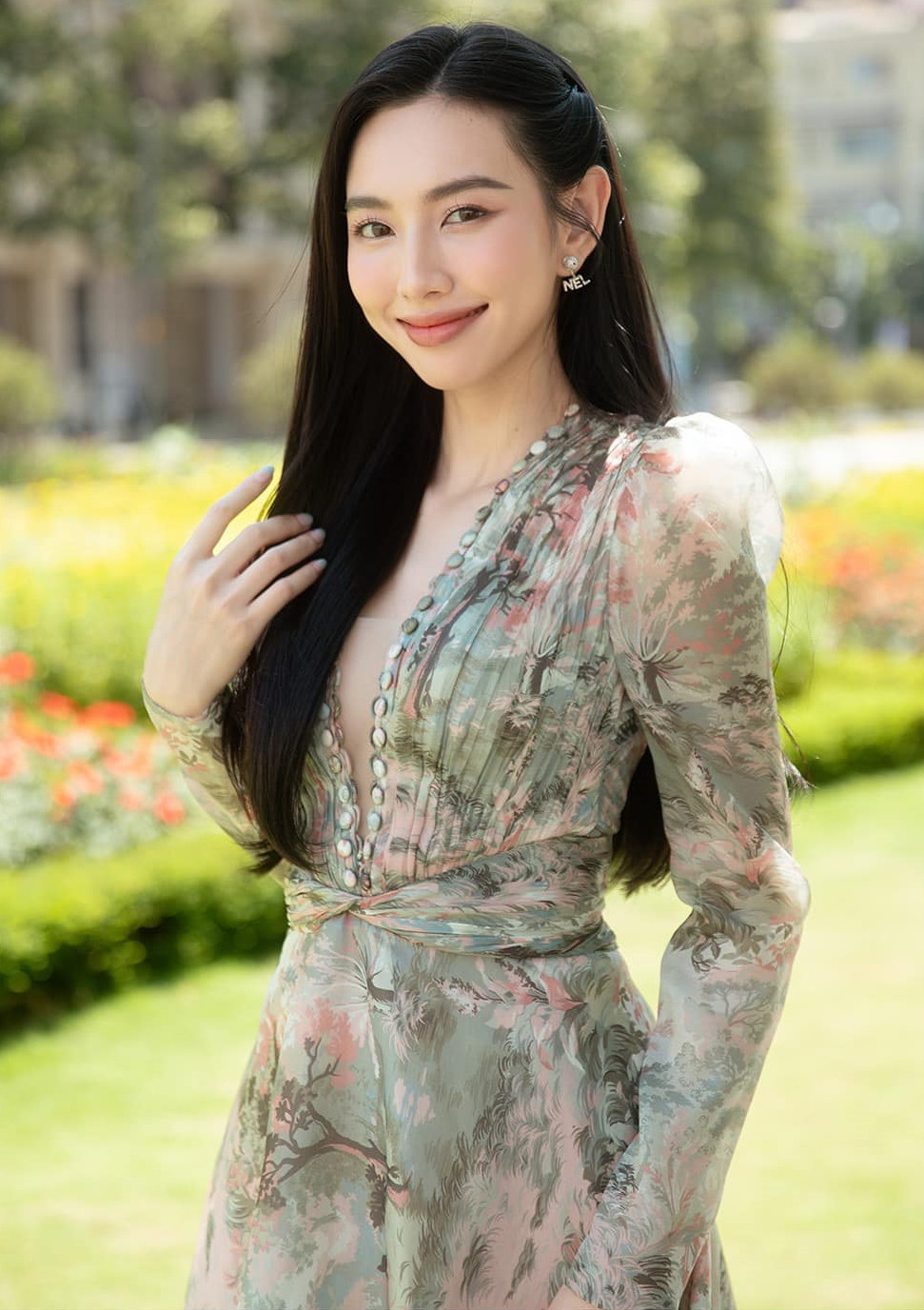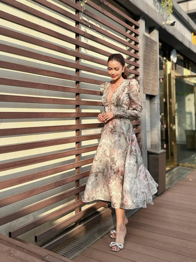 Hoa hậu Thùy Tiên cũng không đứng ngoài cơn sốt váy hoa này. Trong thiết kế gốc, bộ váy đã có thêm lớp voan màu da che bớt phần cổ chữ V để người mặc không gặp phải sự cố trang phục. Nhưng Thùy Tiên còn cẩn thận hơn nữa khi chỉnh sửa để lớp voan này dày hơn.