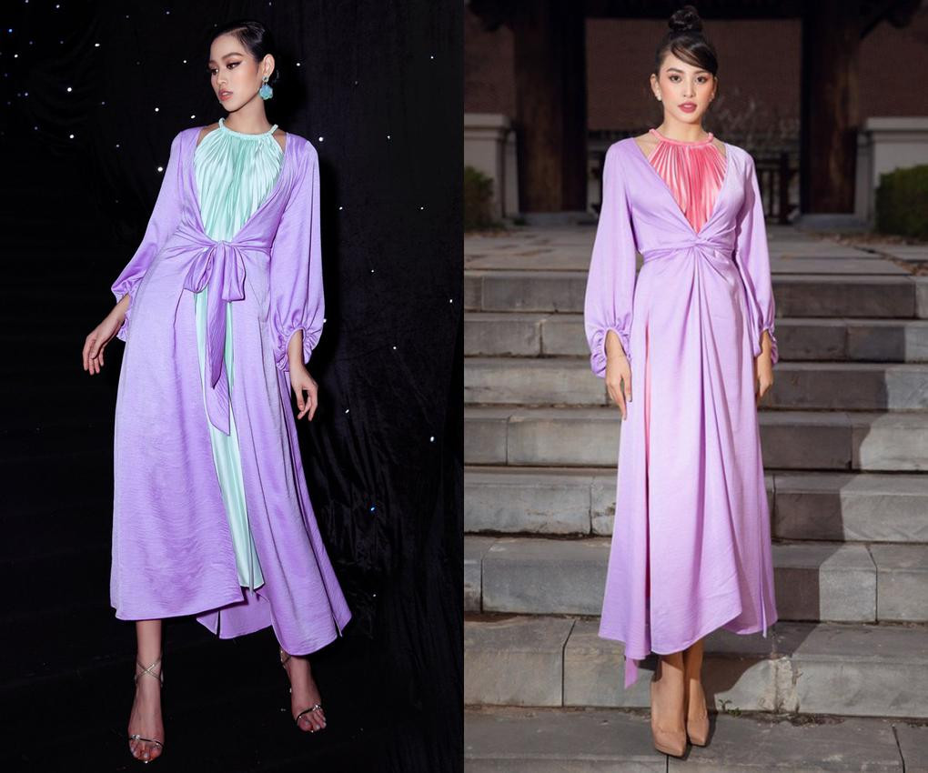 Trước đó, cả Đỗ Thị Hà và Tiểu Vy cũng đụng hàng bộ váy yếm đào kèm áo choàng đậm chất dân tộc của nhà thiết kế Adrian Anh Tuấn. Hai nàng Hoa hậu vô tình chọn áo choàng màu tím nhạt, chỉ khác màu váy bên trong tạo ra phong cách khác biệt: Tiểu Vy trẻ trung còn Đỗ Thị Hà dịu dàng.