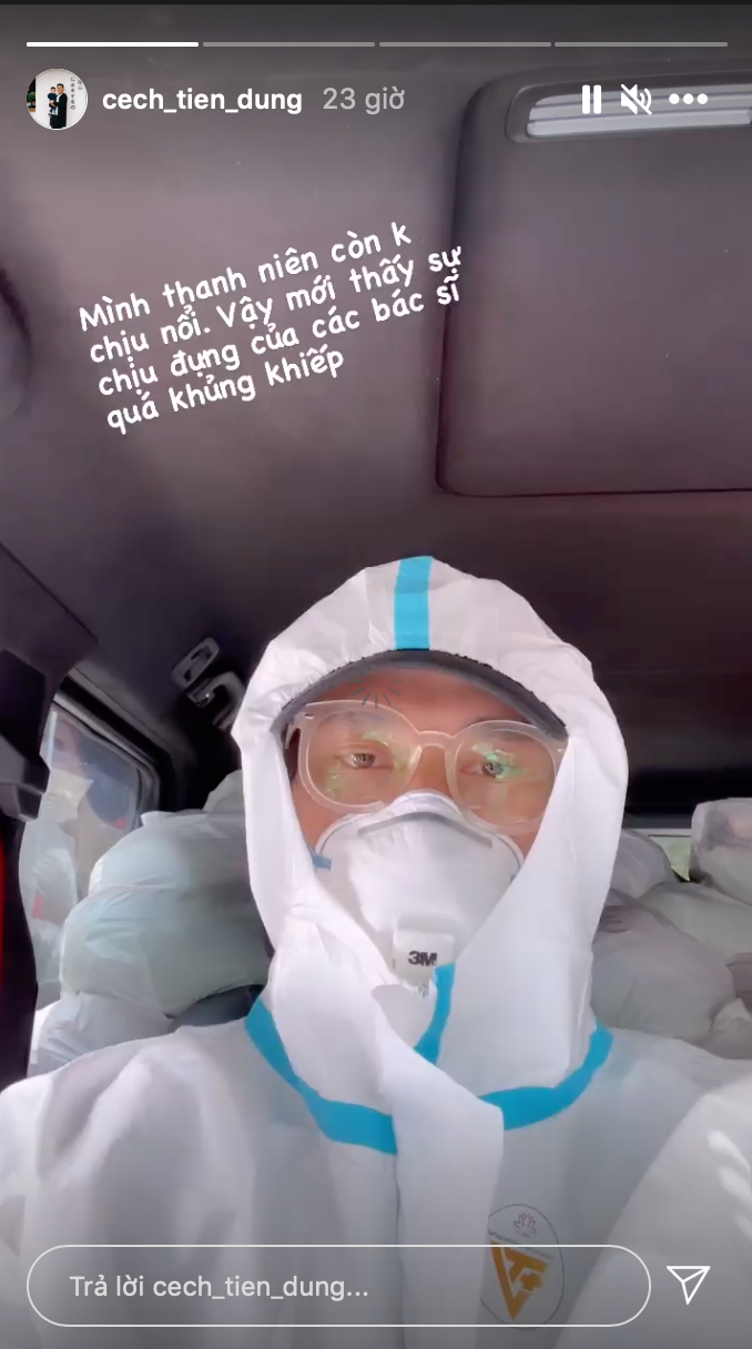 Chàng thủ môn cũng chia sẻ tâm trạng khi khoác lên mình bộ đồ bảo hộ. Bùi Tiến Dũng bày tỏ sự đồng cảm với các y bác sĩ, đội ngũ y tế tuyến đầu chống dịch phải mặc lên mình bộ đồ bảo hộ hằng ngày để tham gia công tác phòng chống dịch COVID-19: "Mình thanh niên còn không chịu nổi. Vậy mới thấy sự chịu đựng của các bác sĩ quá khủng khiếp".