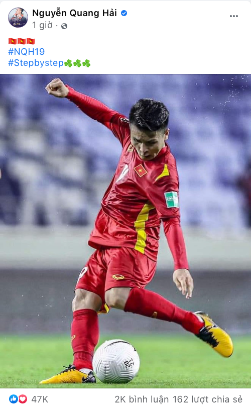 Mới đây, tiền vệ số 19 của đội tuyển bóng đá Việt Nam vừa đăng tải một bức ảnh trên trang cá nhân cùng phần chú thích là biểu tượng quốc kỳ Việt Nam. Động thái này cho thấy nam cầu thủ đang dành sự tập trung cao độ và vô cùng háo hức trước trận ra sân gặp đội tuyển Australia trên SVĐ Mỹ Đình trong khuôn khổ vòng loại cuối của mùa giải World Cup 2022 vào 19h ngày mai 7/9.