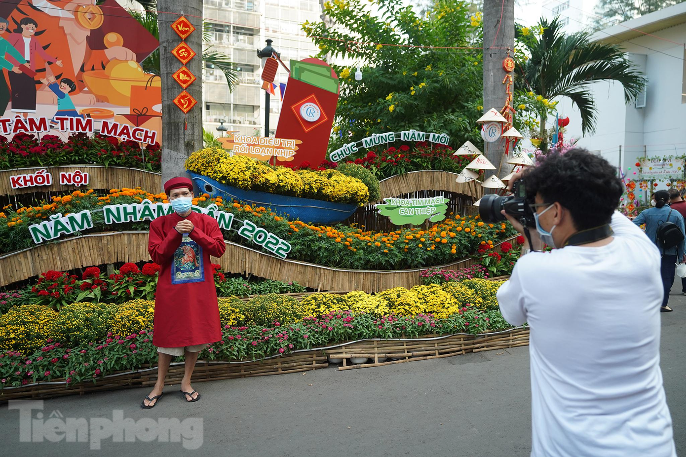 | Đường hoa mang đến nhiều niềm vui cho bệnh nhân và người nhà. Ông Trần Ngọc Dũng (quê Đồng Tháp) tranh thủ mượn chiếc áo dài của bệnh viện chuẩn bị sẵn để chụp lại khoảnh khắc trên đường hoa. "Tôi ở quê lên chăm mẹ bị bệnh ung thư, bà đang hóa trị nên phải ăn Tết trong bệnh viện. Chờ mẹ khỏe lại, tôi sẽ đưa bà xuống đây ngắm hoa cho đỡ nhớ nhà. Bệnh viện cho chúng tôi món ăn tinh thần ngày tết, thật ấm lòng” – ông Dũng tâm sự. |