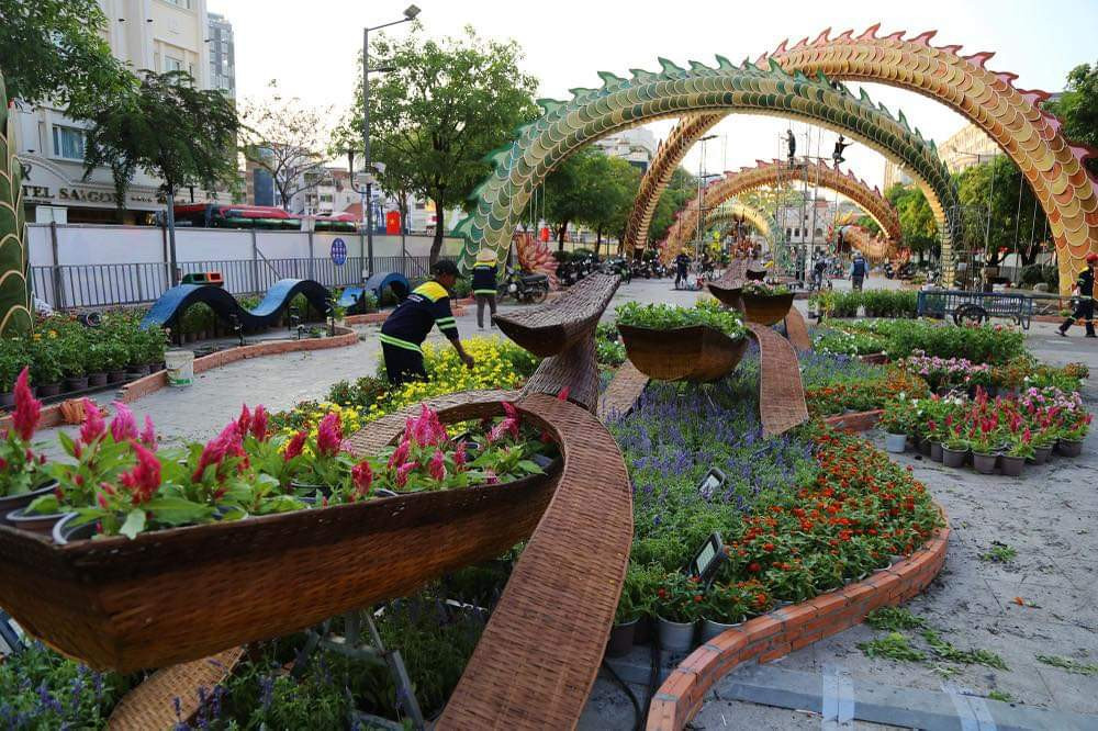Ghi nhận của phóng viên, hiện đường hoa Tết tại phố đi bộ Nguyễn Huệ (Q. 1) đã sắp hoàn thành 100% tiến độ, các công nhân thi công đường hoa, linh vật đang tất bật hoàn thành những công đoạn cuối cùng theo kế hoạch để kịp phục vụ du khách tham quan.