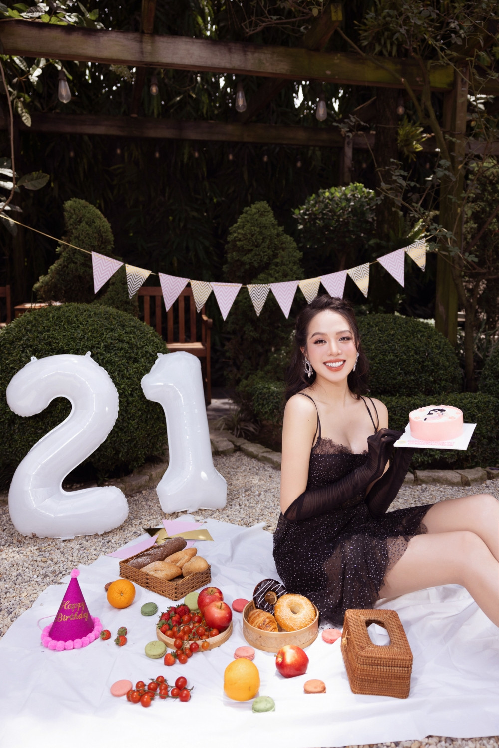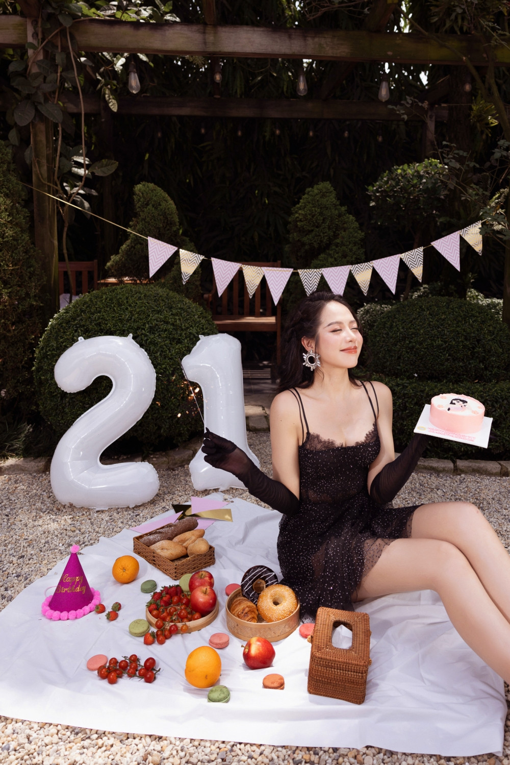 Trong bộ ảnh đón tuổi mới, Hoa hậu Thanh Thủy chọn lối trang điểm ngọt ngào cùng chiếc váy ngắn màu đen. Nàng hậu tạo dáng bên chiếc bánh kem màu hồng cùng bóng bay tuổi “21”.