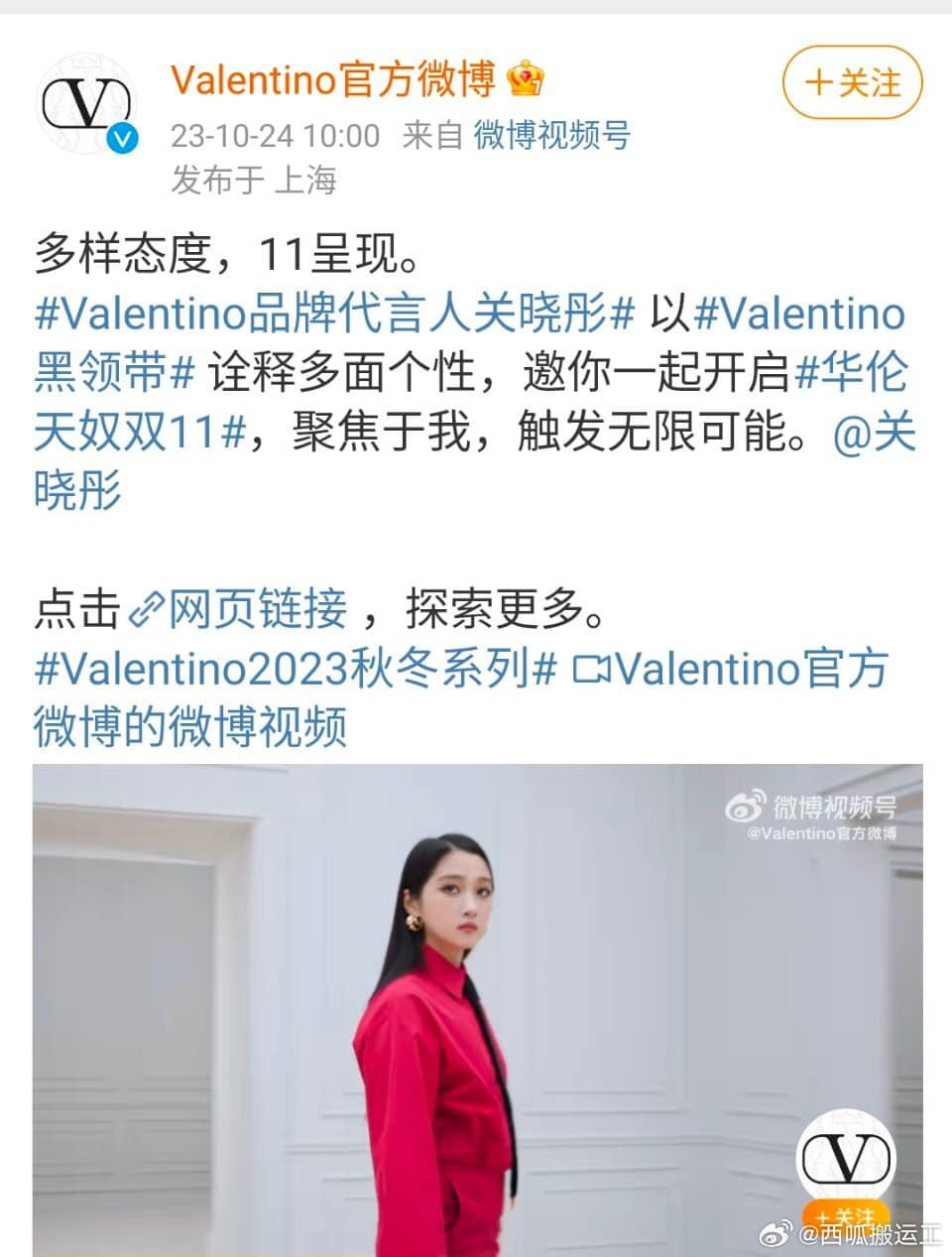 Mới đây, Valentino đưa ra thông báo về việc bổ nhiệm vị trí gương mặt đại diện (phát ngôn) mới cho thương hiệu Valentino. Danh phận cao nhất của nhà mốt Ý gọi tên nữ diễn viên Quan Hiểu Đồng.
