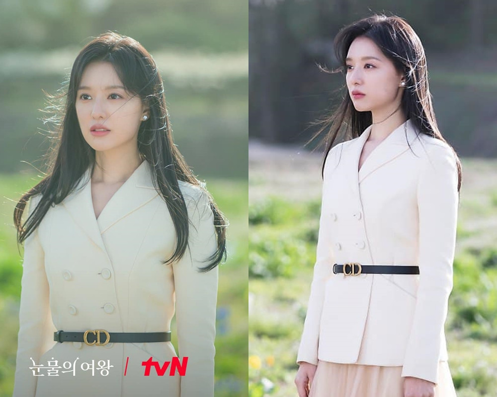 Chẳng hạn khi Hong Hae In dùng máy bay riêng tới quê nhà của Hyun Woo để tìm anh, cô chọn áo blazer trắng kết hợp với váy voan vừa quyền lực vừa dịu dàng. Thêm một chiếc thắt lưng nhỏ xinh của Dior là hoàn thiện được diện mạo đại tiểu thư của Hae In.
