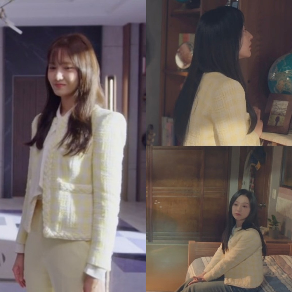 Vì đều thích style dịu dàng, nữ tính nên hai nàng nữ chính chọn áo khoác cũng giống nhau. Mẫu áo khoác vải tweed màu vàng nhạt được phối theo cách khác nhau và đều rất đẹp. Yoona mặc cả bộ kèm áo blouse thắt nơ còn Kim Ji Won lại kết hợp với quần, nhìn chững chạc hơn.