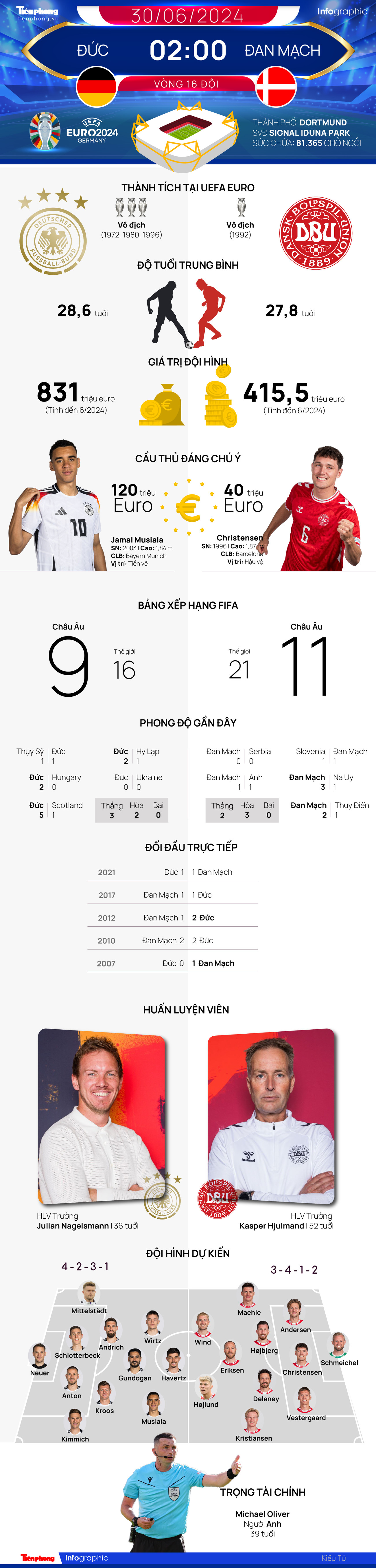 Google News EURO 2024 - Vòng 16 đội: Tương quan đội hình trước trận Đức vs Đan Mạch, 2 giờ ngày 30/6