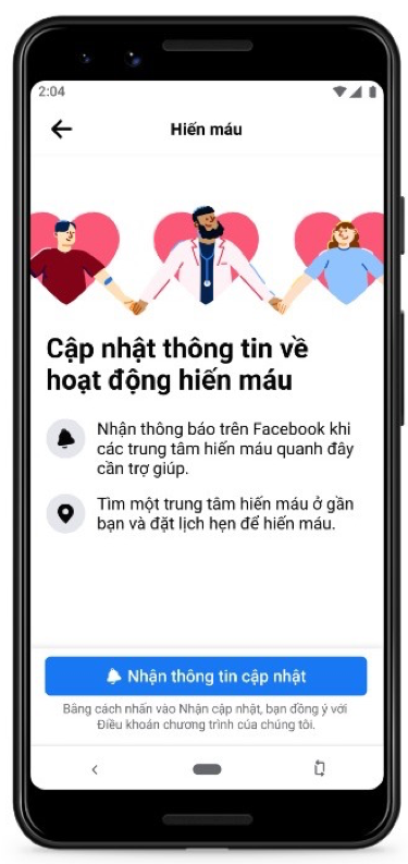 Theo đó, tính năng Hiến máu trên Facebook kết nối những người muốn hiến máu với các chương trình hiến máu. Người dùng có thể đăng ký nhận thông báo về các chương trình hiến máu nhân đạo gần mình. Tính năng này góp phần thúc đẩy hành vi hiến máu trong đời sống.