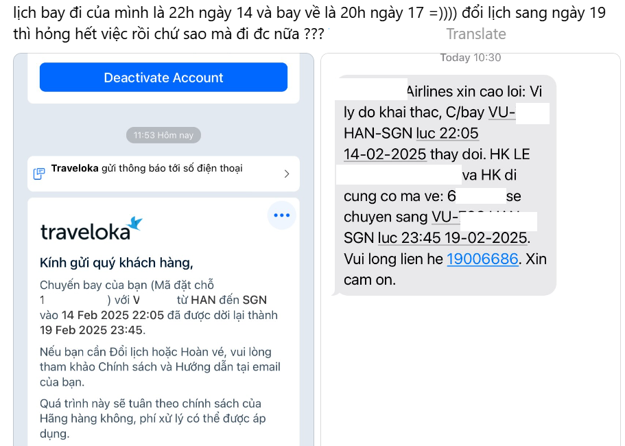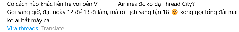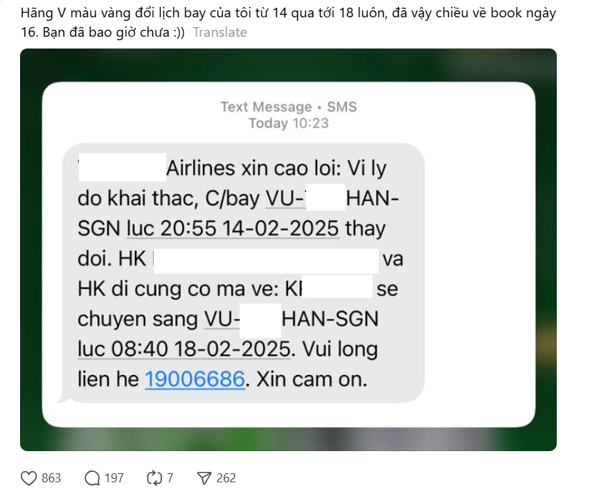 Từ tối 8/2, trên mạng xã hội Threads, nhiều cư dân mạng bày tỏ bức xúc và bối rối khi bị hãng hàng không V. Airlines thông báo lùi lịch bay khi chỉ còn cách thời gian bay ban đầu chưa đến 1 tuần. Đáng chú ý, lịch bay không phải bị lùi vài tiếng mà tới 3 - 6 ngày. Những người dùng này cho biết họ mua vé vào ngày 12/2 hoặc 14/2, mới nhận thông báo bị lùi chuyến bay qua ngày 18/2.