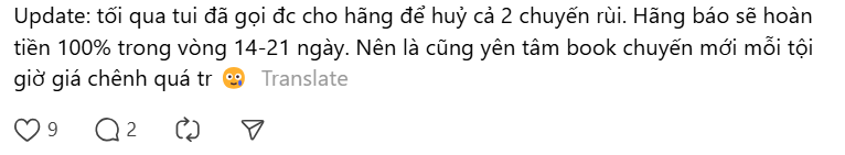 Sáng 9/2, theo chia sẻ của một cư dân mạng, cô cho biết mình đã liên hệ được với hãng và hủy 2 chuyến bay, được hoàn 100% tiền vé trong vòng 14 - 21 ngày. Giải pháp được các netizen khuyên nhau trong trường hợp này là đề nghị hoàn tiền và mua vé bay khác.