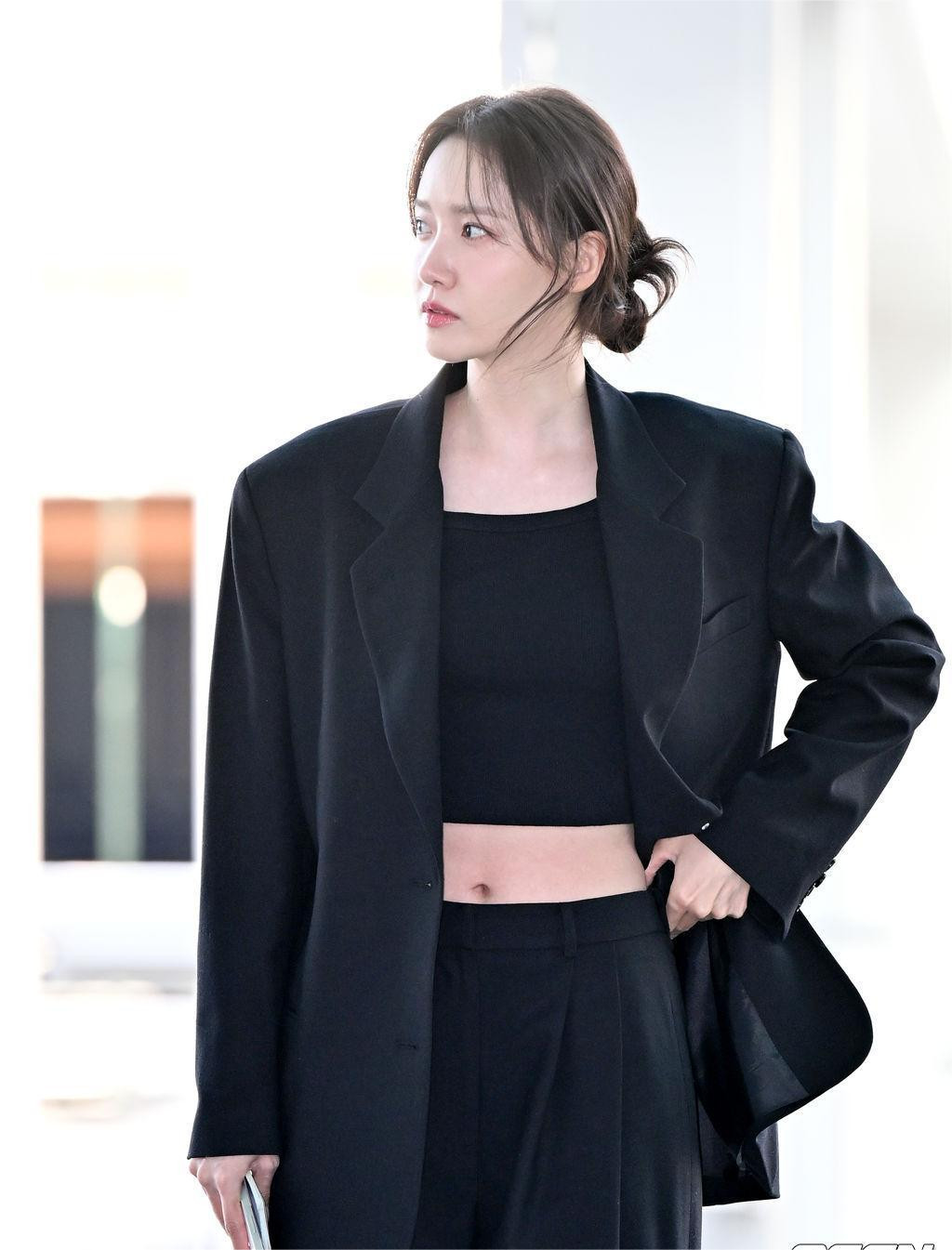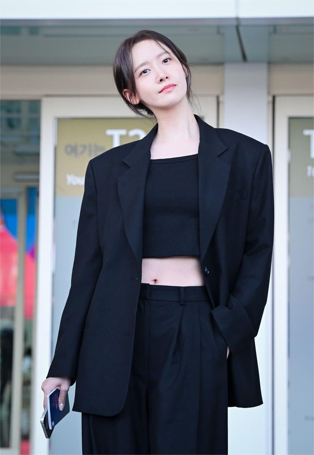 Yoona xuất hiện với diện mạo thanh lịch, năng động khi diện áo crop-top khoe eo thon, khoác ngoài là blazer dáng dài kết hợp với quần ống rộng. Cô trang điểm nhẹ nhàng và búi tóc thấp. Cách phối không mới nhưng lại tôn lên vóc dáng và giúp Yoona "hack tuổi".