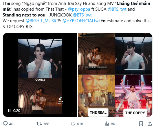 Đồng thời, nhiều fanpage, blog của BTS, Jung Kook tại Việt Nam cũng kêu gọi cộng đồng fan mass trend trên X (Twitter), tag tài khoản của BigHit Music và HYBE để yêu cầu công ty chủ quản xem xét, vào cuộc làm rõ nghi vấn đạo nhái của Chẳng Thể Nhắm Mắt với Standing Next To You.