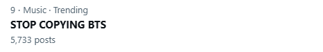 Hiện tại, từ khóa "stop copying BTS" (hơn 5.700 bài đăng) và "standing" (112K bài đăng) đang lọt top thịnh hành mạng xã hội X Việt Nam. Các fan đang tiếp tục kêu gọi mass trend để các từ khóa liên quan sớm lọt top thịnh hành toàn cầu.