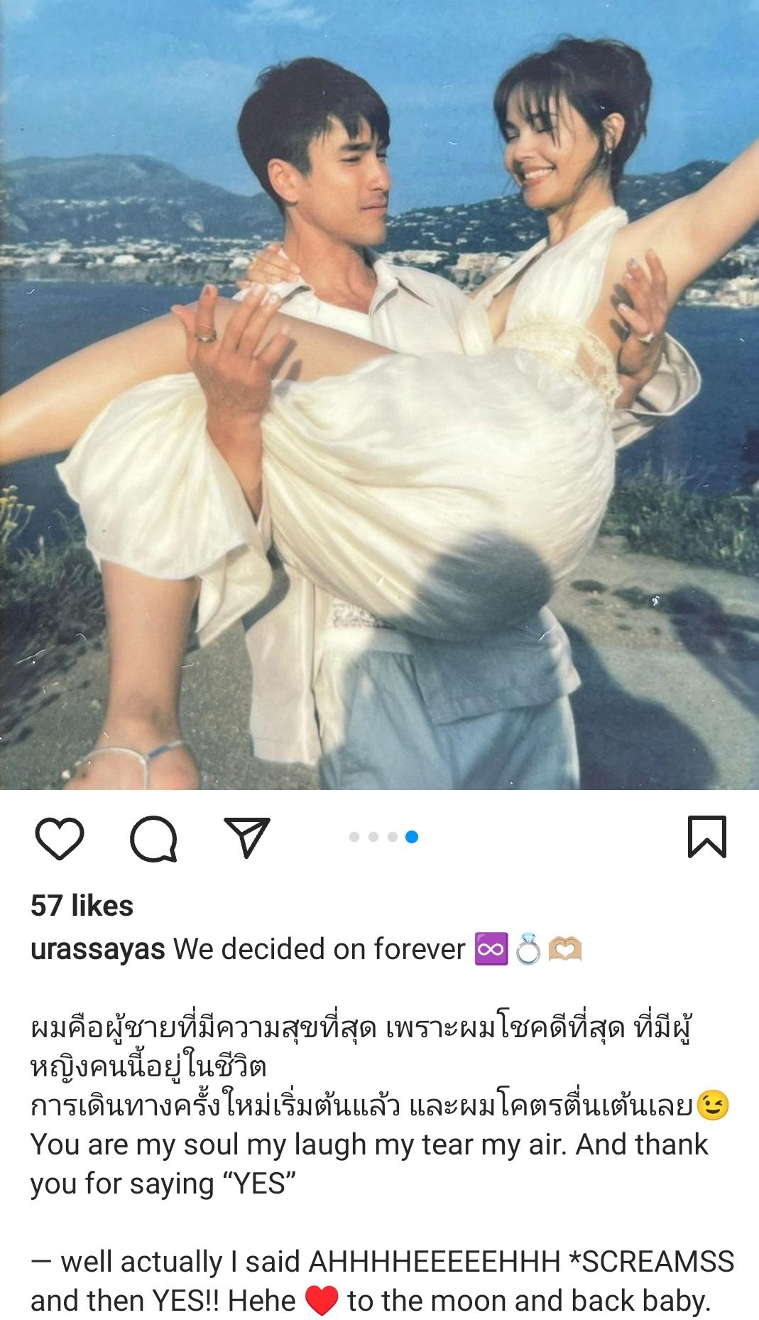 Mới đây, các fan của showbiz Thái Lan nói chung và cặp đôi Nadech Kugimiya - Yaya Urassaya nói riêng muốn bùng cháy, vỡ òa vì hạnh phúc. Trên trang mạng xã hội cá nhân, Nadech đã đăng bài viết thông báo anh đã cầu hôn Yaya, và cô đã đồng ý.